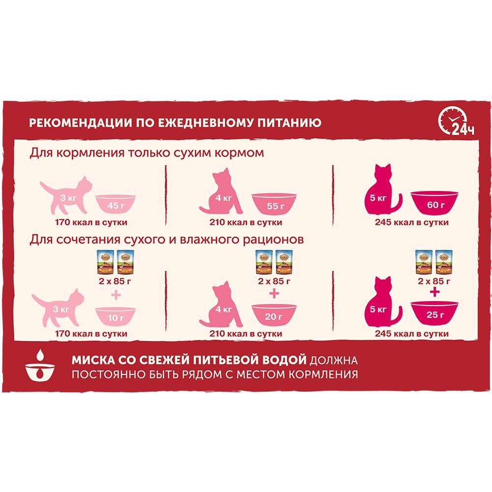 Nature’s Table™. Полнорационный корм, предназначенный только для взрослых кошек. Рекомендации по ежедневному питанию: - масса кошки 2-3 кг – 2-3 пакетика; - масса кошки 4-5 кг – 3-4 пакетика; - масса кошки 6-7 кг – 4-5 пакетиков. Кормите вашу кошку кормом комнатной температуры. Миска со свежей питьевой водой должна постоянно быть рядом с местом кормления.