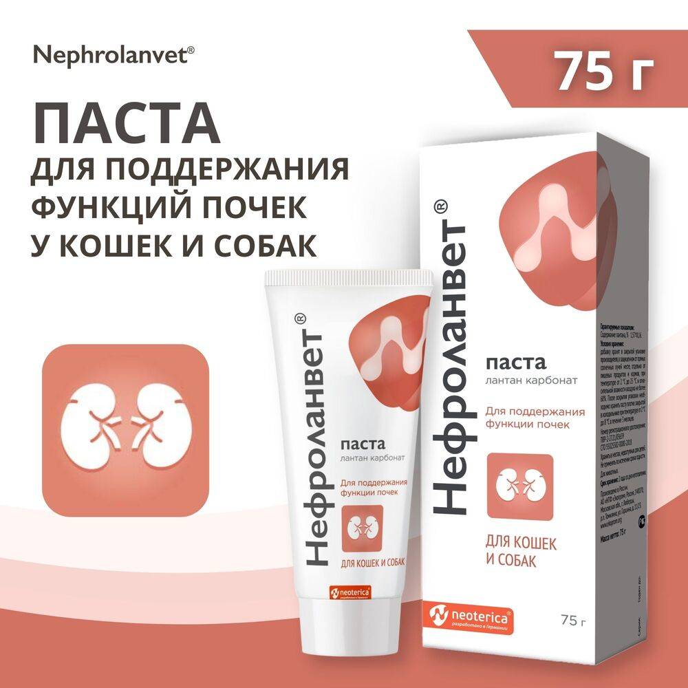 Лечить почечную недостаточность нужно комплексно и начинать лечение нужно со снижения нагрузки на почки. Эту нагрузку даёт фосфор, который поступает с едой и выводится из организма с мочой. При неправильной работе почек фосфор накапливается в организме, что приводит к ухудшению состояния питомца. Паста Нефроланвет — кормовая добавка для поддержания функции почек при хронической почечной недостаточности у кошек и собак.