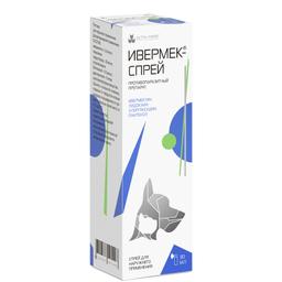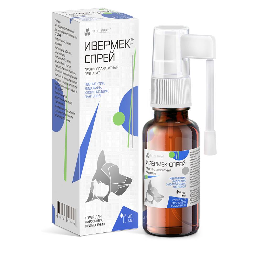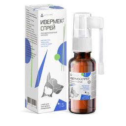 Ивермек-спрей обладает выраженным акарицидным действием на преимагинальные и имагинальные фазы развития саркоптоидных (Sarcoptes spp., Psoroptes spp., Otodectes cynotis, Notoedres cati) и демодекозных (Demodex canis) клещей, паразитирующих у собак, кошек, пушных зверей и грызунов, а также кнемидокоптозных клещей (Knemidocoptes spp.), паразитирующих у птиц. Механизм действия ивермектина, входящего в состав препарата, заключается в его воздействии на величину тока ионов хлора через мембраны нервных и мышечных клеток паразита. Основной мишенью являются глутаматчувствительные хлорные каналы, а также рецепторы гамма-аминомасляной кислоты. Изменение тока ионов хлора нарушает проведение импульсов, что приводит к параличу и гибели паразитов. Вспомогательные компоненты препарата — пантенол и лидокаин оказывают ранозаживляющее и местное анестезирующее действие с выраженным противозудным эффектом, хлоргексидина биглюконат проявляет антибактериальное и противовоспалительное действие. После наружного применения лекарственного средства ивермектин, практически не всасываясь в системный кровоток, в основном накапливается в эпидермисе, волосяных луковицах и сальных железах тела животного, оказывая акарицидное действие в течение 5 – 7 дней. Ивермек-спрей по степени воздействия на организм теплокровных животных относится к малоопасным веществам, в рекомендуемых дозах не оказывает кожнораздражающего и резорбтивно-токсического действия. При попадании в глаза ивермек-спрей вызывает слабое раздражение. Препарат токсичен для рыб и пчел.
