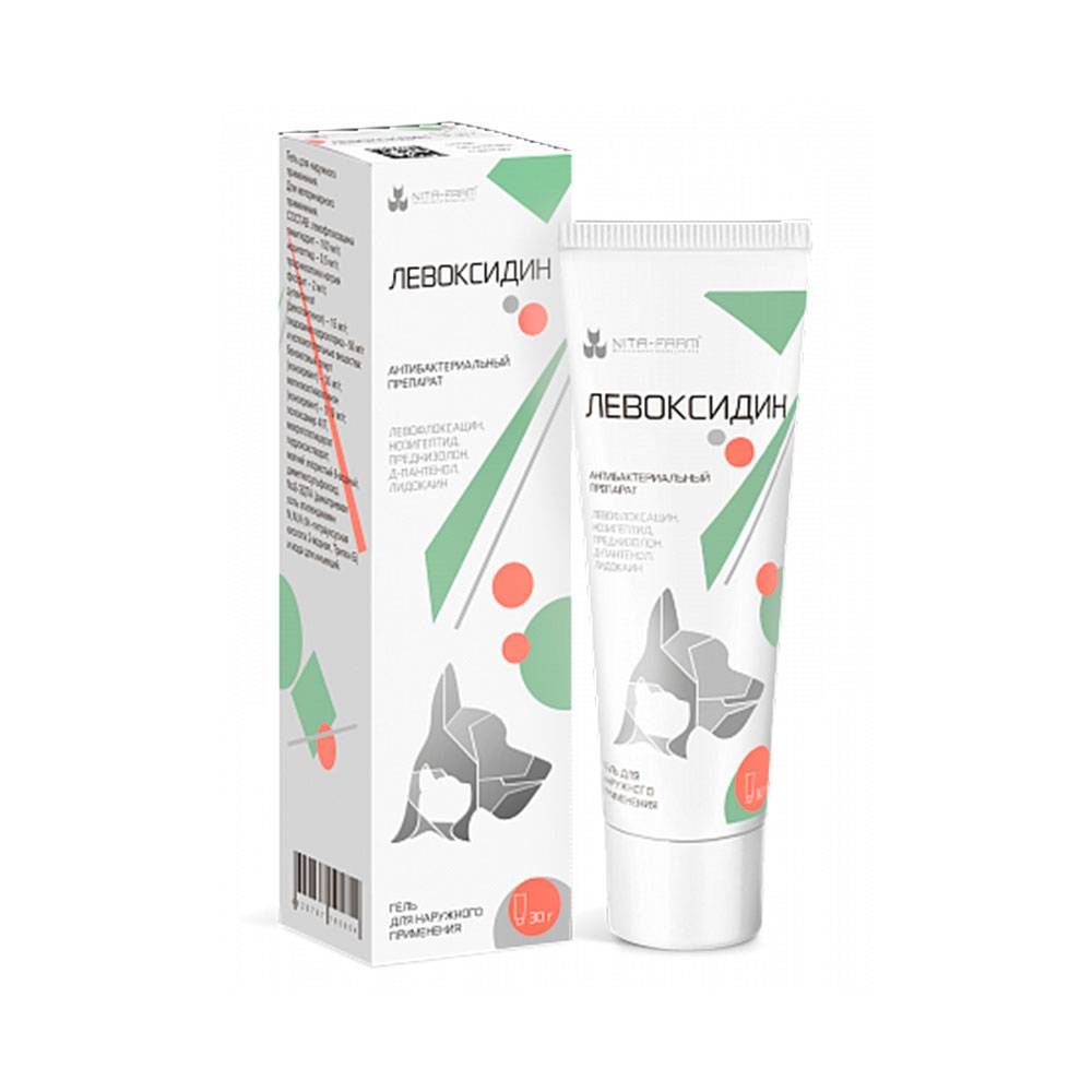 Левоксидин - гель для наружного применения на основе левофлоксацина, нозигептида, преднизолона, Д-пантенола и лидокаина для лечения кошек и собак при воспалительных заболеваниях кожи и мягких тканей, вызванных микроорганизмами чувствительными к левофлоксацину и нозигептиду, в том числе при: дерматите (остром, контактном, атопическом, солнечном), пиодермии (поверхностной, глубокой), терапии ран и абсцессов, флегмон, ожогов, пролежней опрелости, обморожения, для профилактики послеоперационных инфекций после проведения кастраций, купирования хвостов, ушей, наложение швов и т.д., а также при осложнениях вторичной инфекцией.