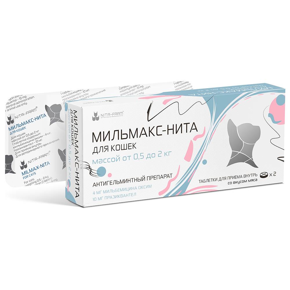 Мильмакс-Нита для кошек от 0,5 до 2 кг: 4 мг мильбемицина оксим, 10 мг празиквантел.