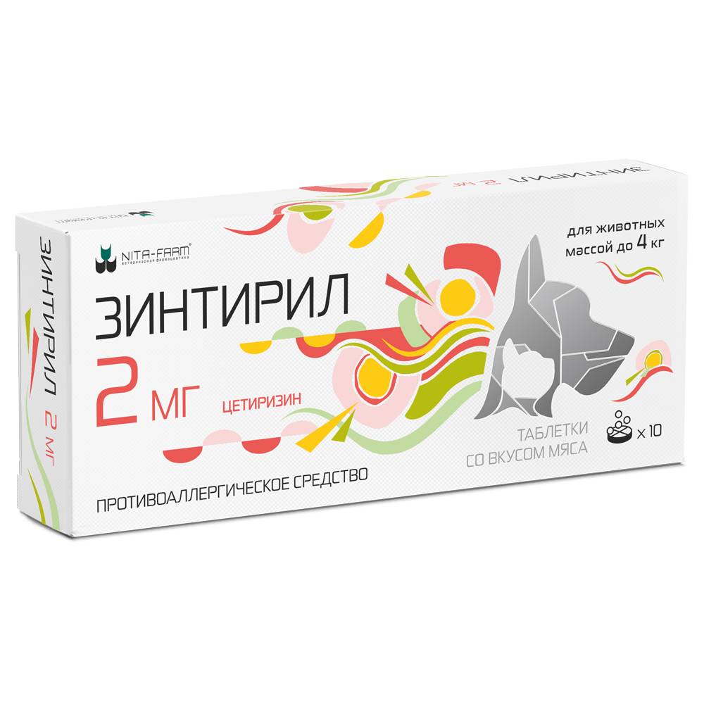 Nita-farm Зинтирил Таблетки противоаллергические для кошек и собак до 4 кг, 2 мг, со вкусом мяса, 10 таблеток