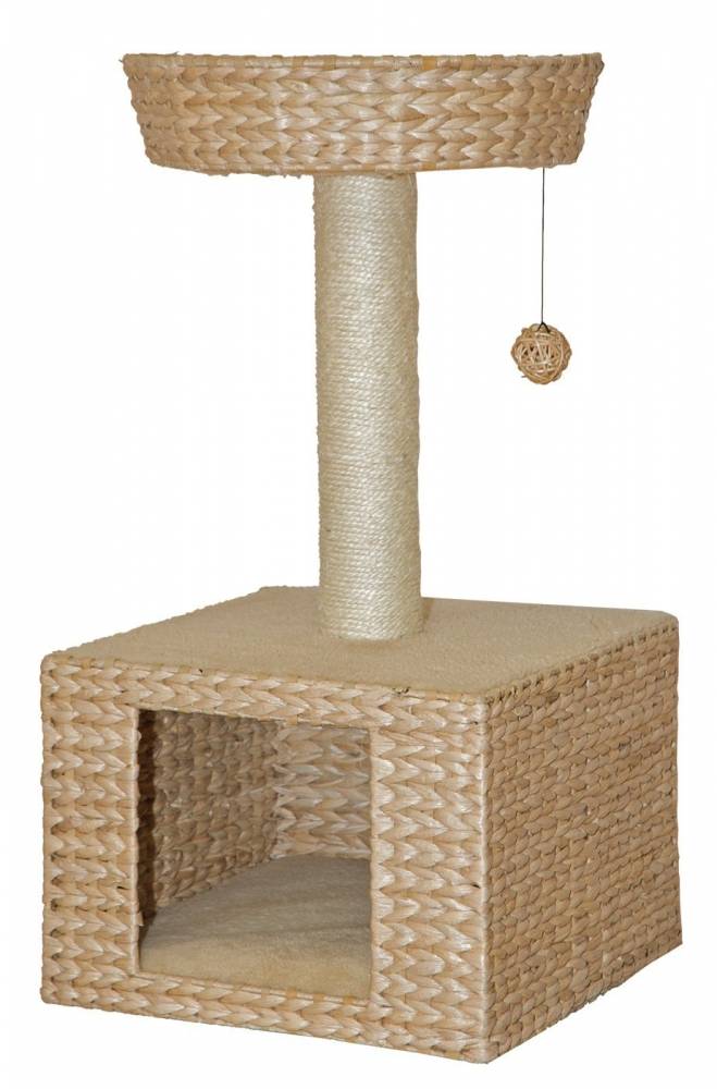 - Плетенная площадка для отдыха на столбике-когтеточке из сизаля диаметром 7,5 см и игрушкой на веревке.