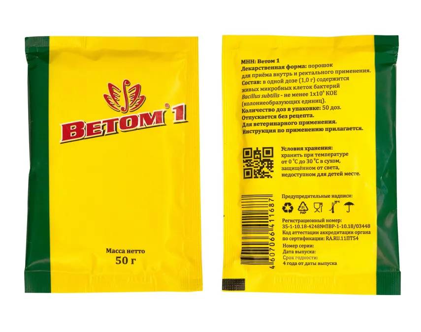 • С целью коррекции иммунодефицитных состояний Ветом 1 назначают 1-2 раза в сутки в дозе по 50 мг/кг живого веса в течение 5-10 дней.