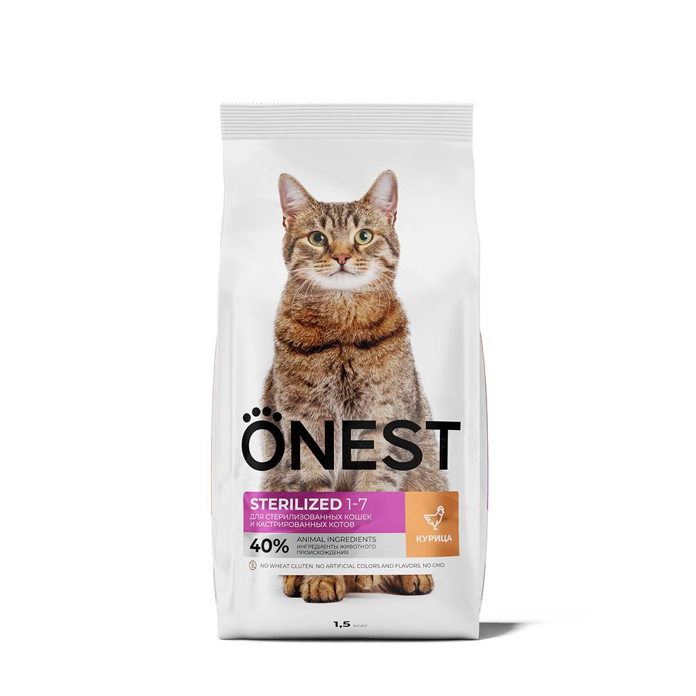 ONEST Sterilized Сухой корм для стерилизованных кошек и кастрированных котов, с курицей, 1,5 кг — это оптимально сбалансированный рацион на каждый день. Состав разработан специально для животных в возрасте от 1 года до 7 лет.