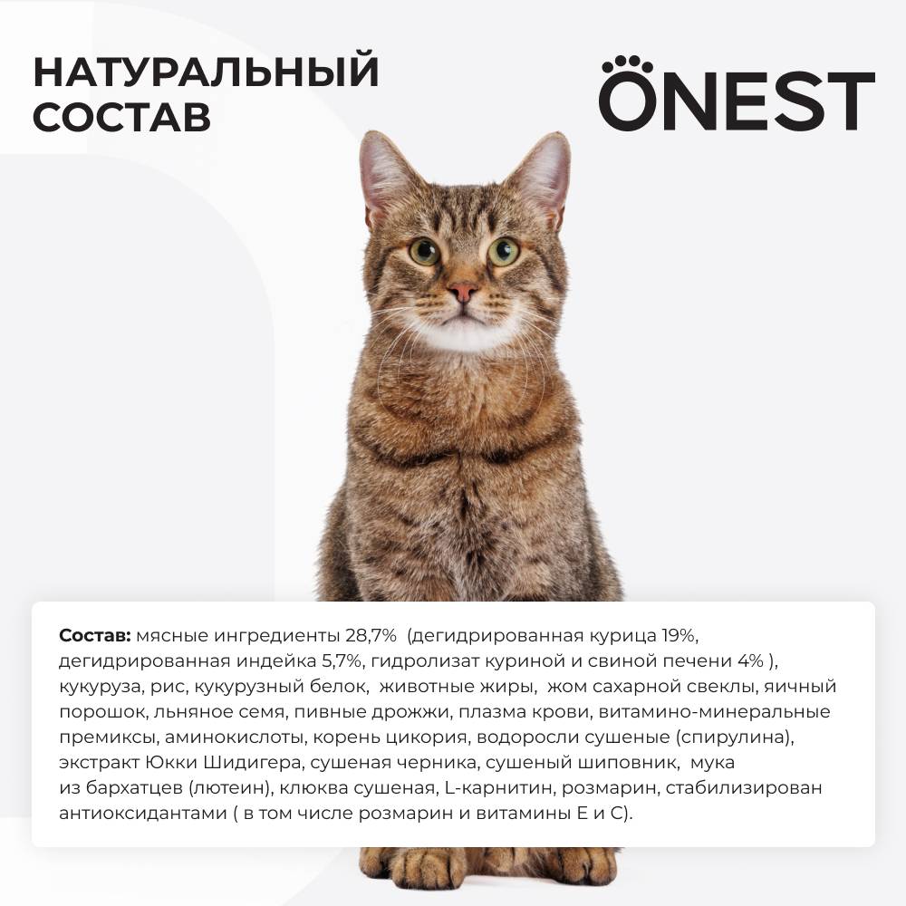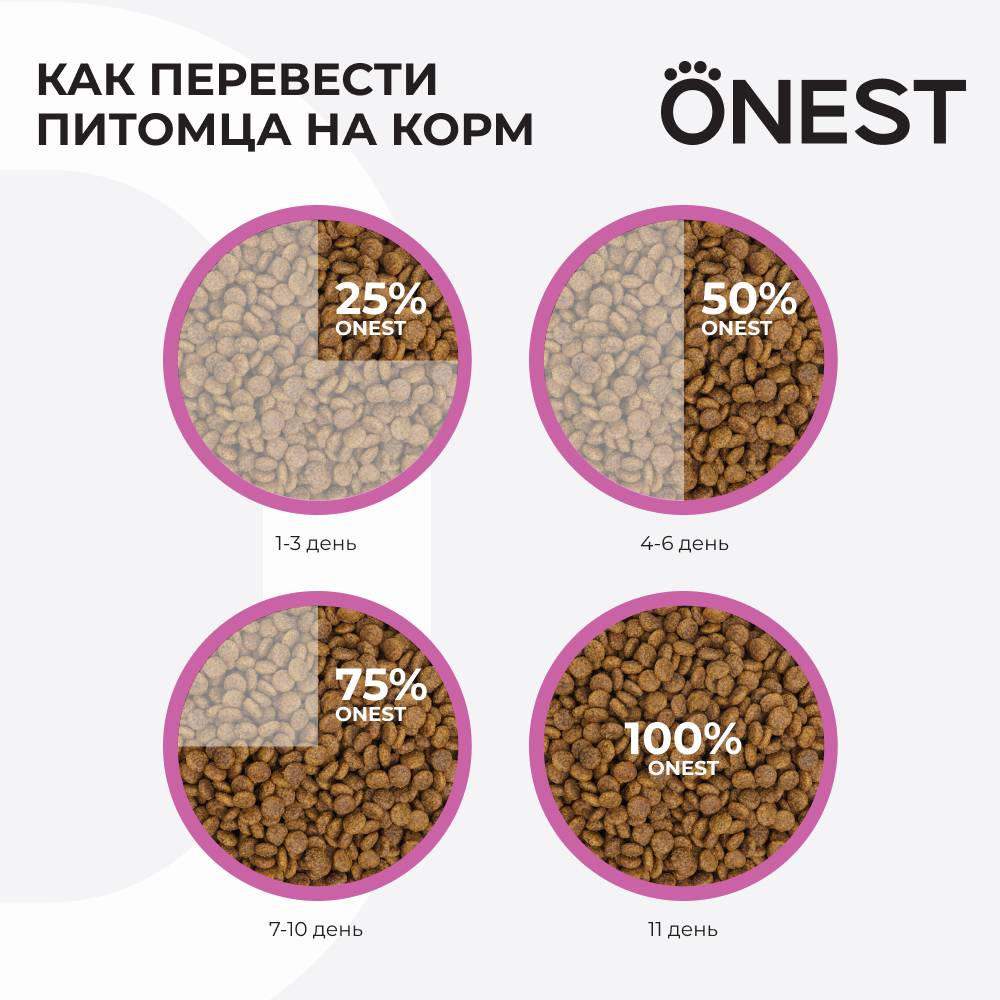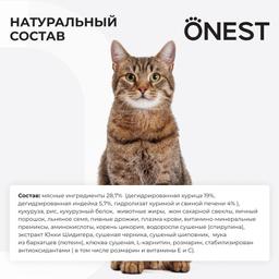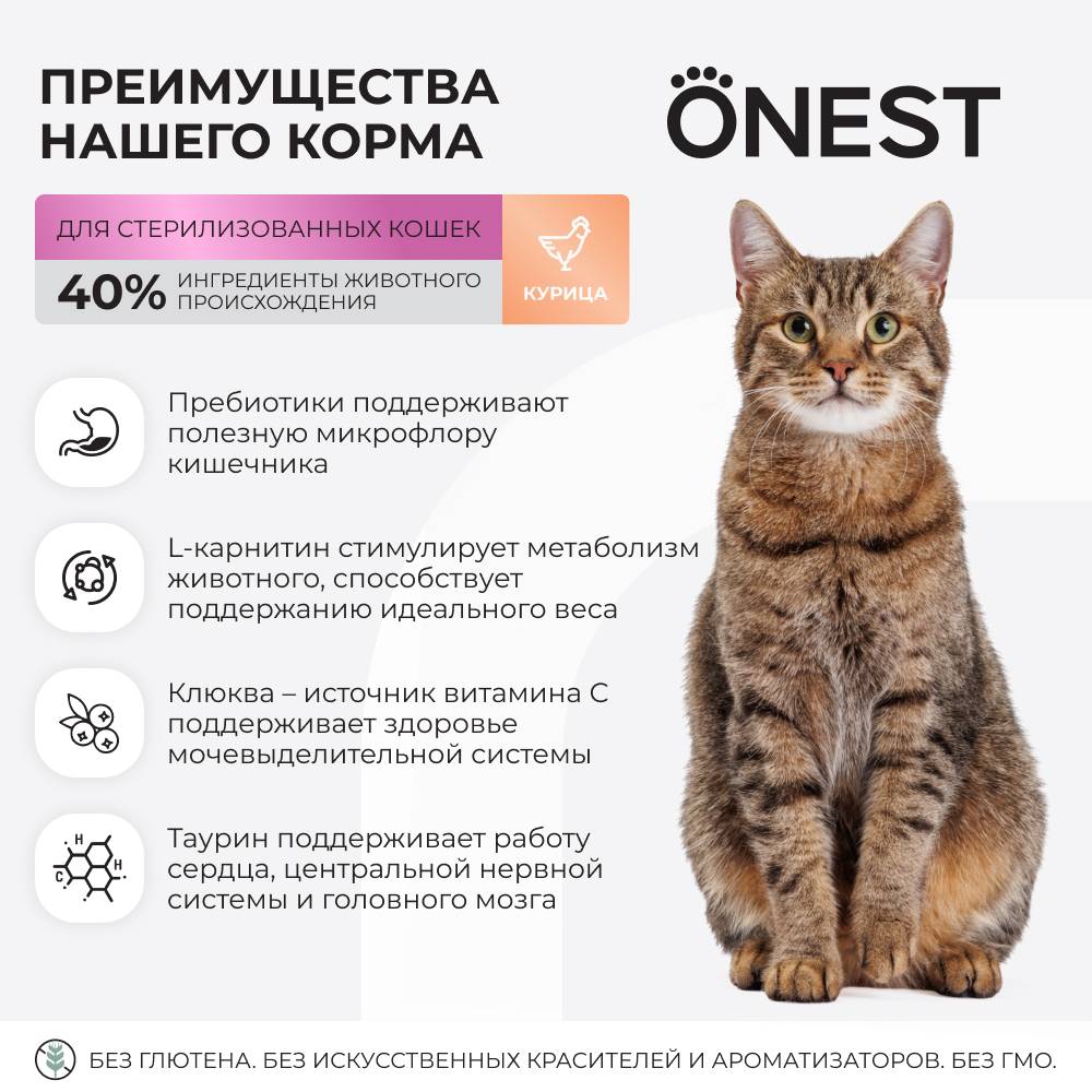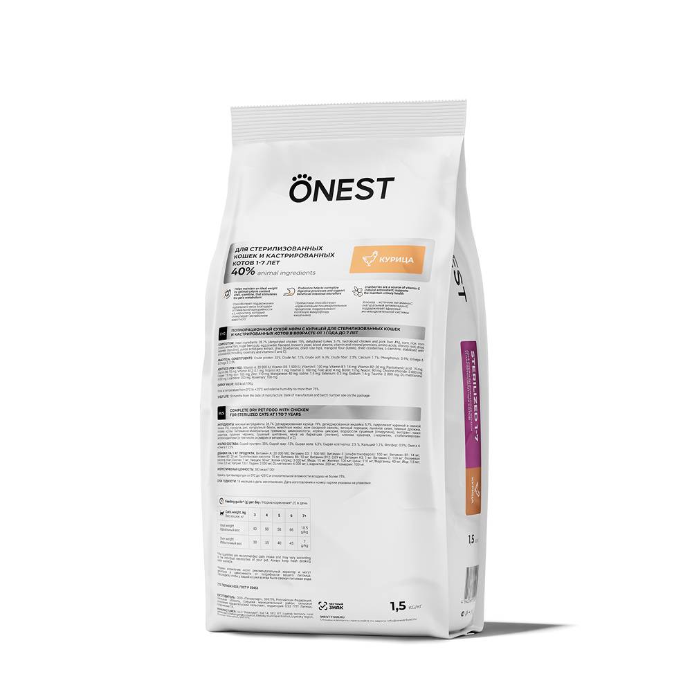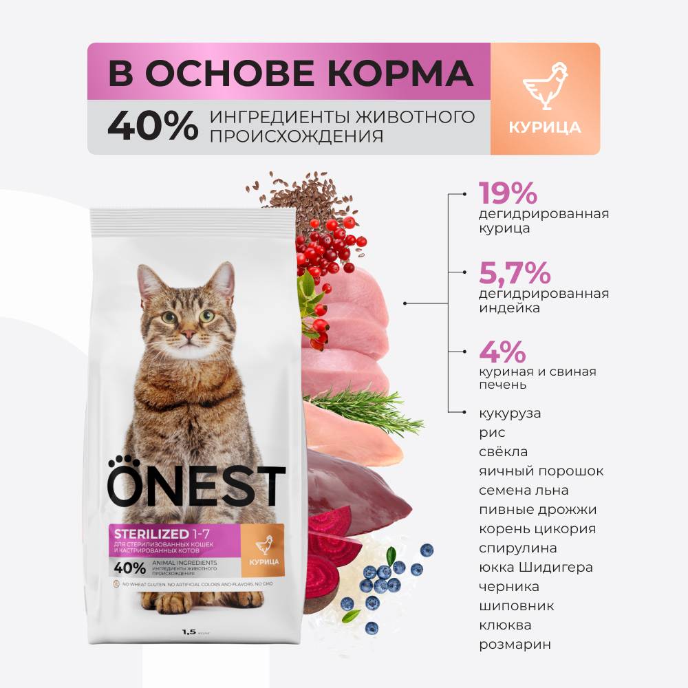 ONEST Sterilized Сухой корм для стерилизованных кошек и кастрированных котов, с курицей, 1,5 кг — это оптимально сбалансированный рацион на каждый день. Состав разработан специально для животных в возрасте от 1 года до 7 лет.