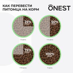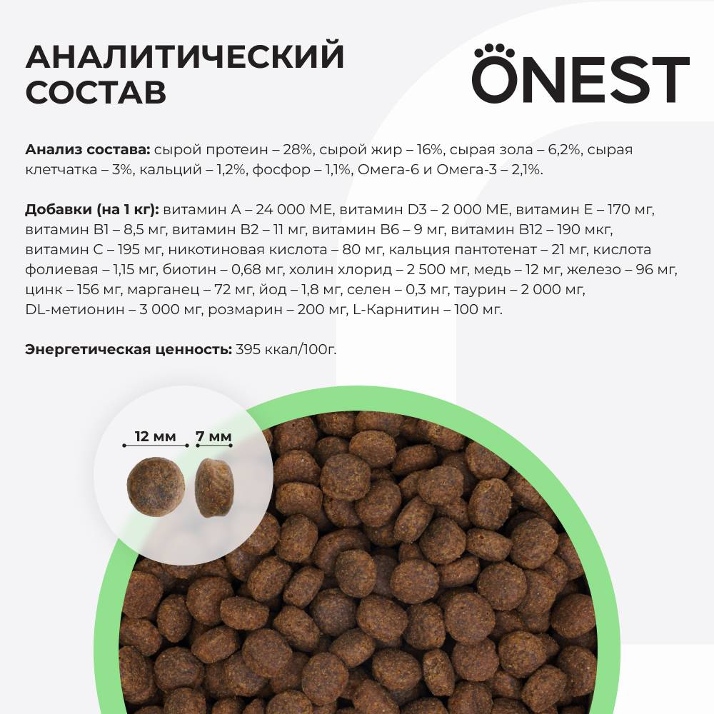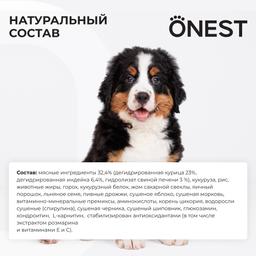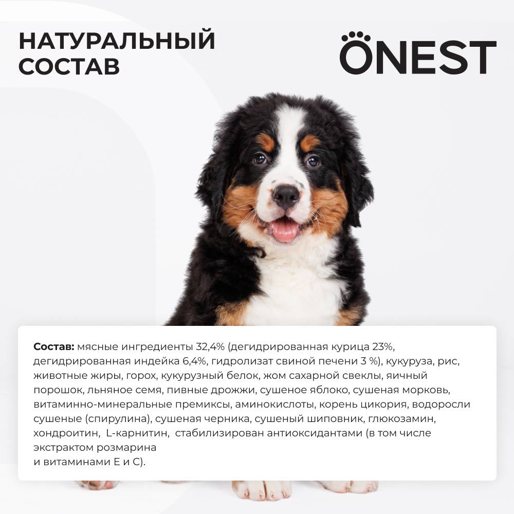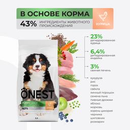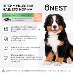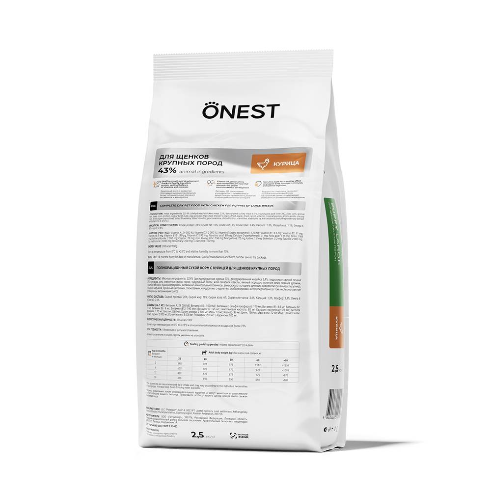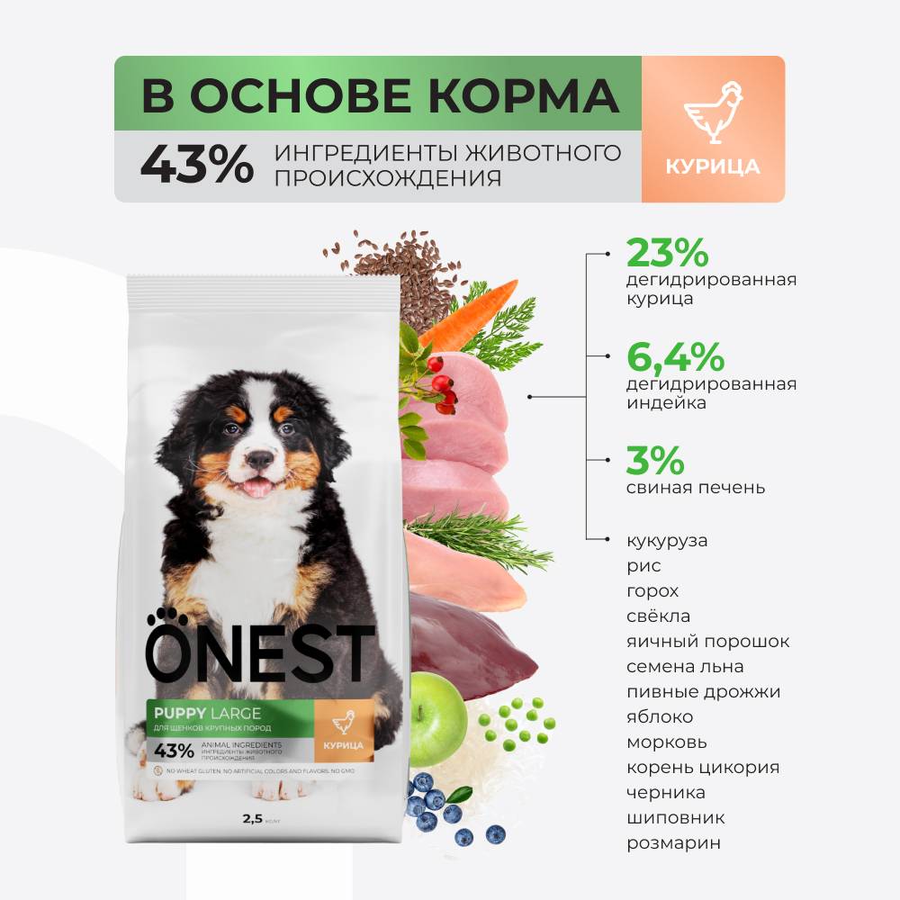 ONEST Puppy Large Сухой полнорационный корм для щенков крупных пород, с курицей, 2,5 кг оптимален для регулярного питания. Благодаря небольшому размеру гранулы легко брать из миски и жевать. Приятный натуральный запах пробуждает аппетит у животного.