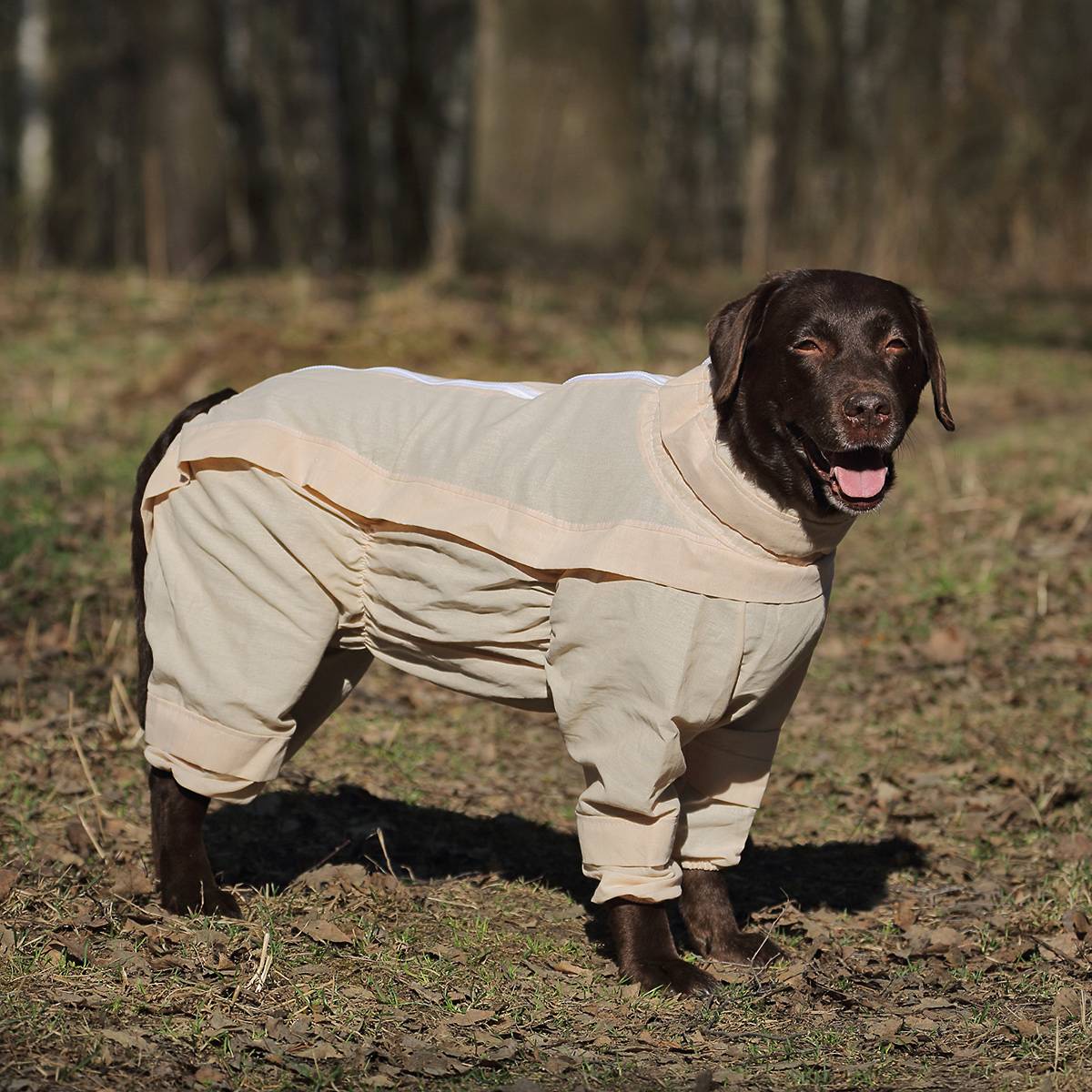 - Комбинезоны от клещей с ловушками обеспечивают комфортные условия пребывания собаки на природе в любую погоду, в том числе и в летнюю жару в пик сезона активности клещей, за счет дышащей ткани из 100% хлопка и светлой расцветки.