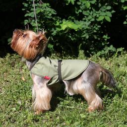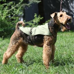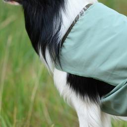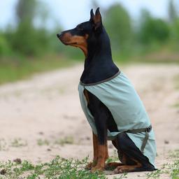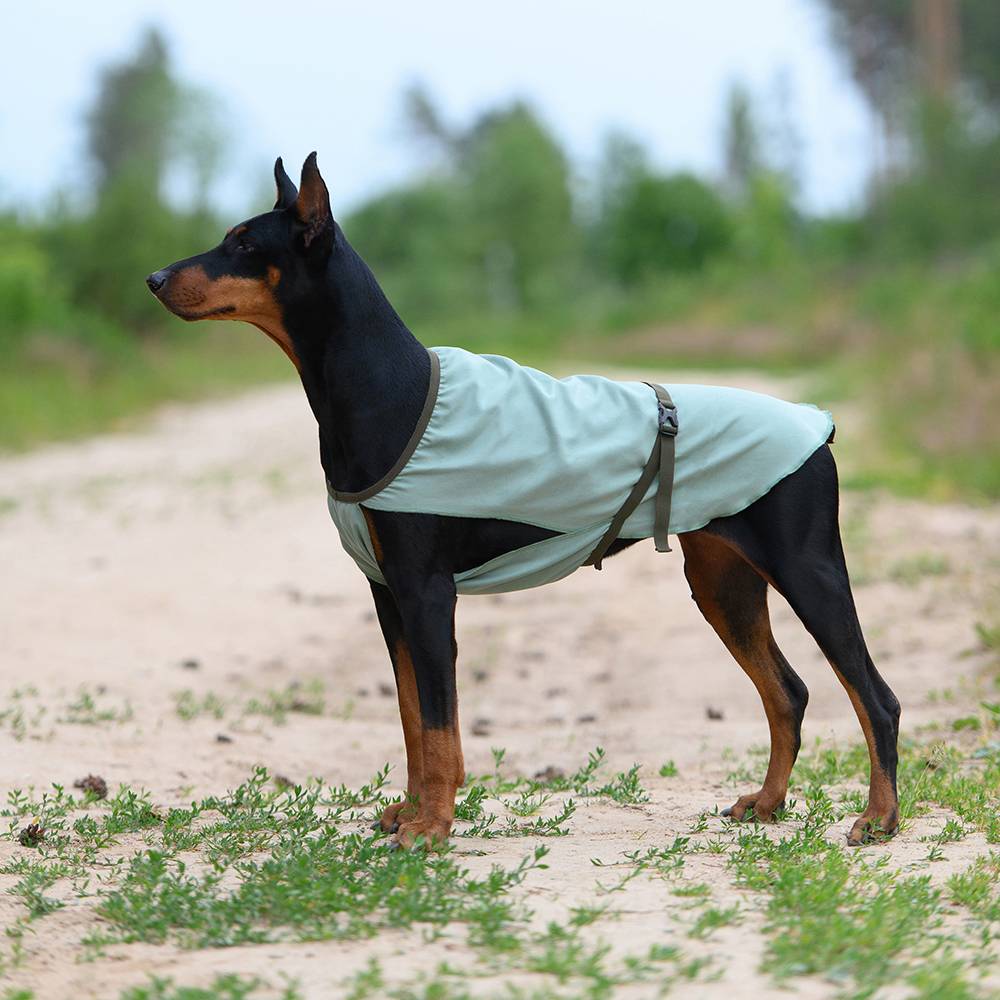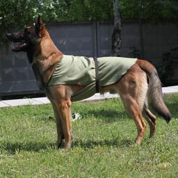 - Попона сшита из двух частей, прикрывающих ― и охлаждающих ― спину и грудь собаки, спереди попона собрана на резинку для комфортной посадки по корпусу, на талии затягивается резинкой с застежкой фастекс, что позволяет фиксировать обе части попоны на корпусе и регулировать размер.