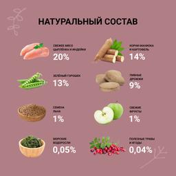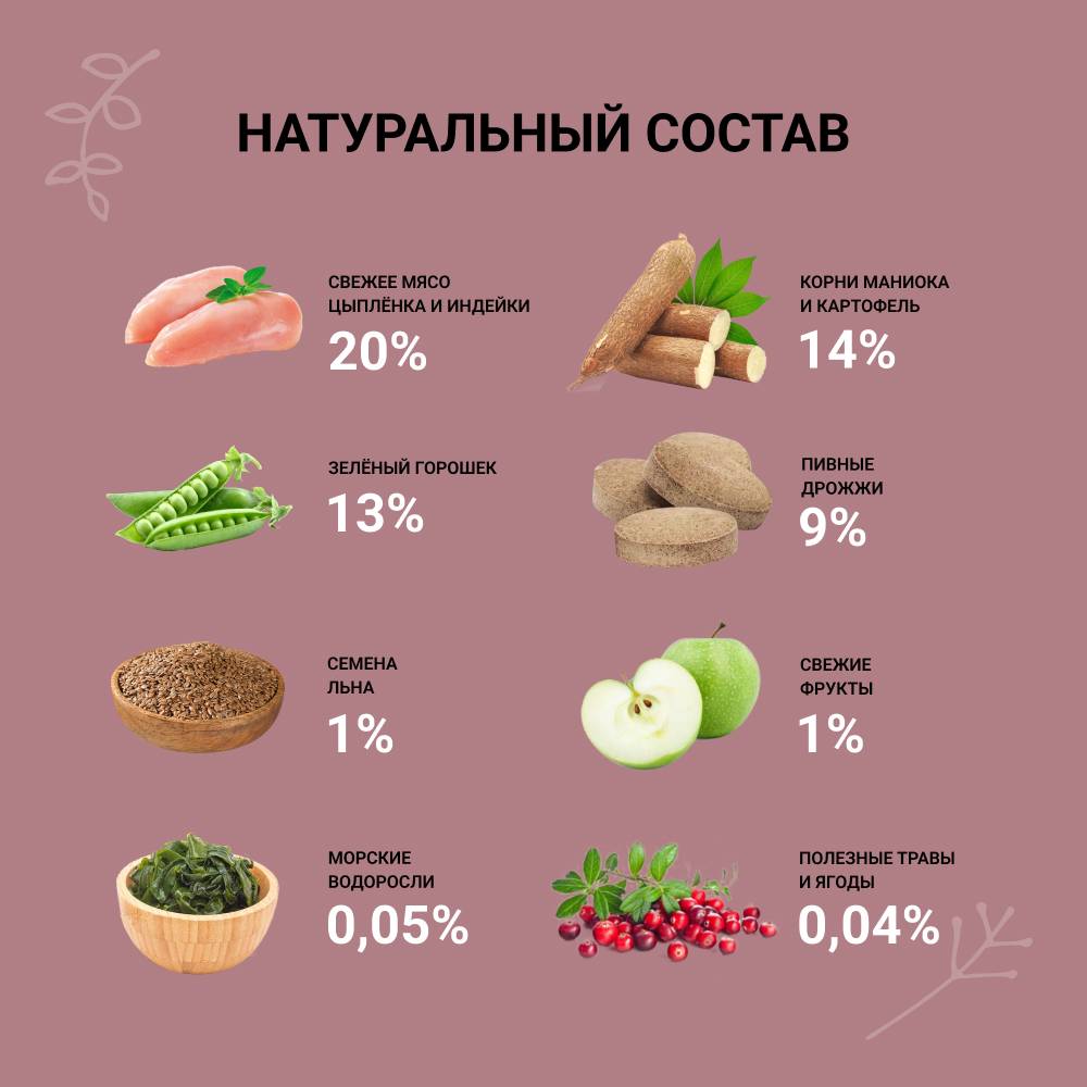 - В основе корма лежит максимальное количество натуральных ингредиентов: свежее мясо, свежие овощи и фрукты, а также водоросли, что позволяет донести до питомца пользу продуктов в том виде, в каком задумала природа.