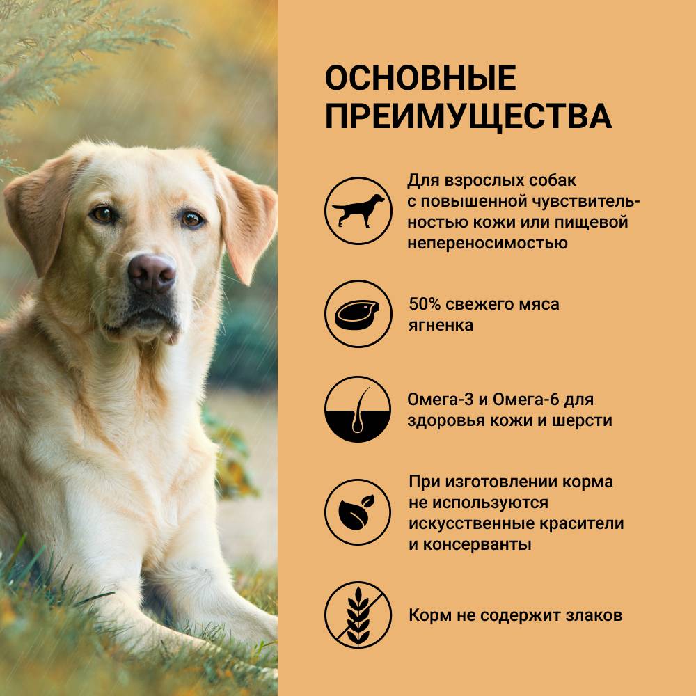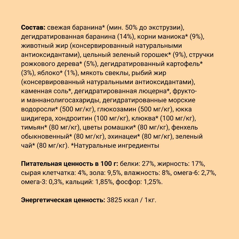 - Изготовлен из натуральных ингредиентов и свежего мяса – до 50% свежего мяса ягненка.