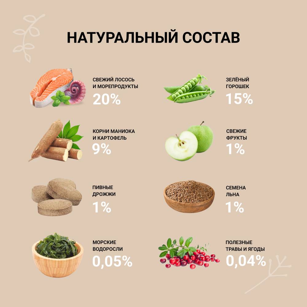 Беззерновой корм с лососем и морепродуктами не содержит злаки и существенно снижает риск возникновения пищевой аллергии.