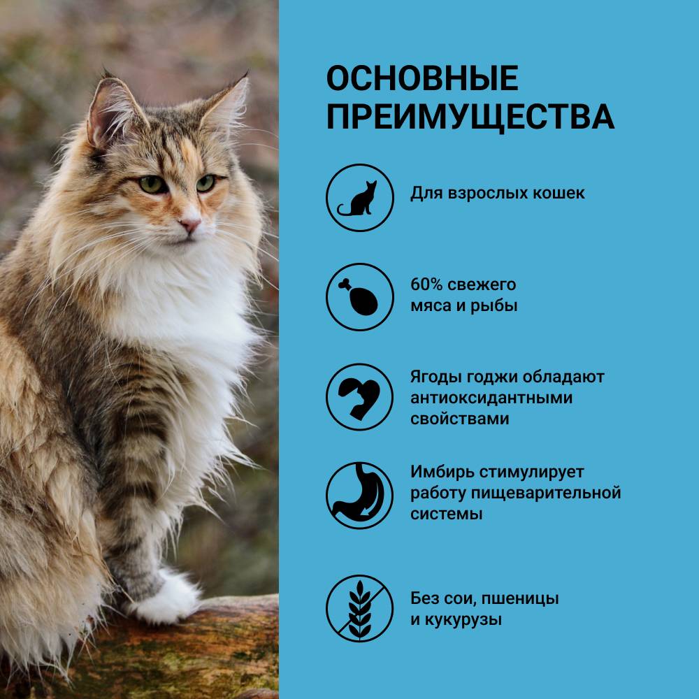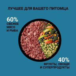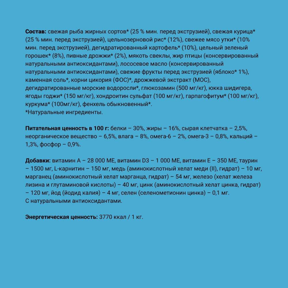 - 60% свежего мяса и рыбы: 25% рыбы, 25% курицы, 10% утки – великолепное сочетание вкусом, перед этим кормом не устоят даже самые капризные домашние питомцы.