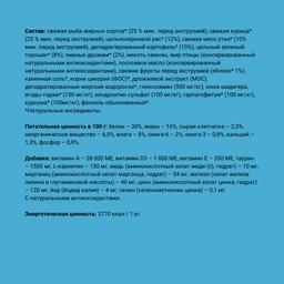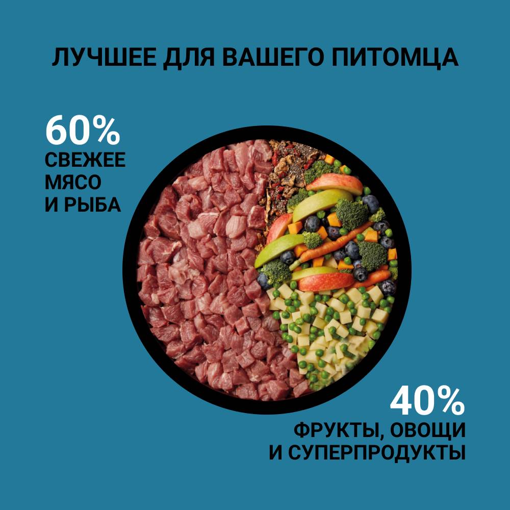- Минимум 90% натуральных ингредиентов – свежее мясо, цельное зерно, свежие овощи, а также водоросли, что позволяет донести до питомца пользу продуктов в том виде, в каком задумала природа.