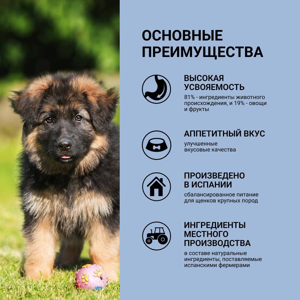 - Богатый протеинами и с высоким содержанием калорий корм способствует здоровому росту щенков крупных пород.
