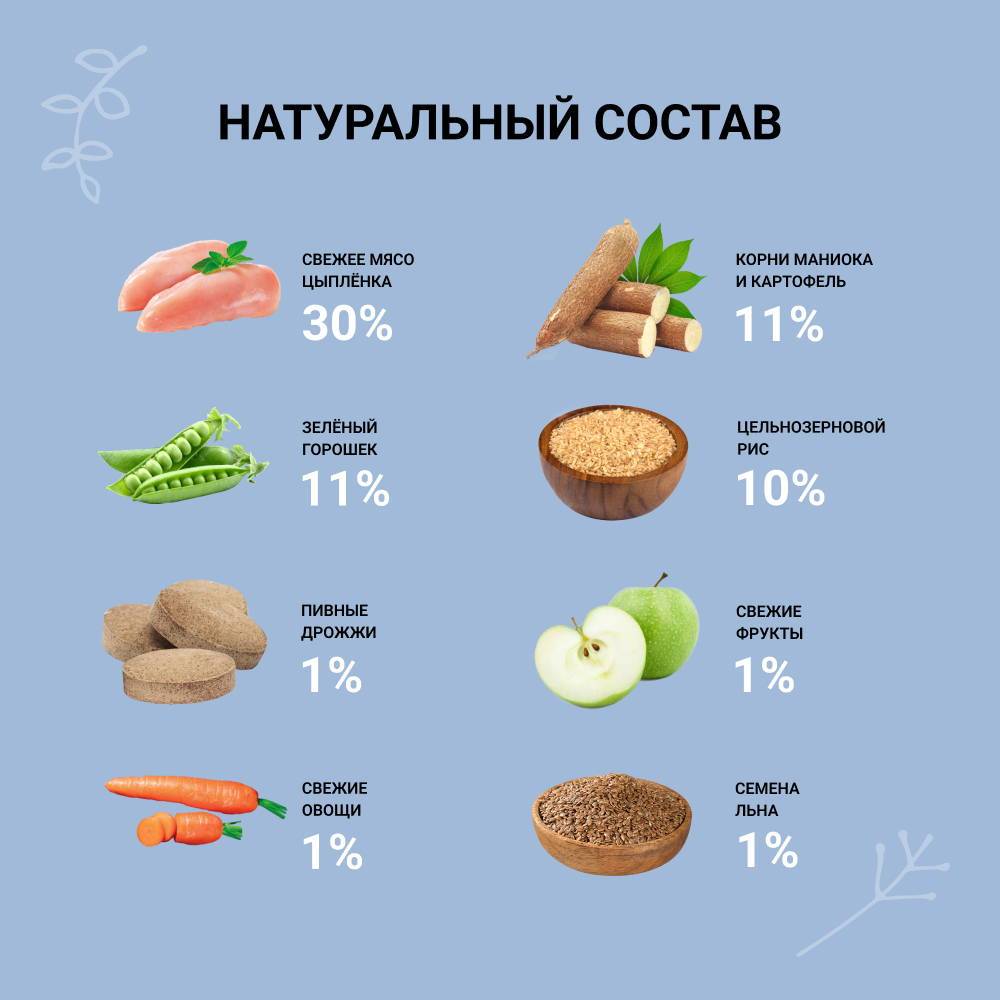 - 30% свежего мяса цыплёнка и индейки гарантирует вкусовую привлекательность для питомца, а общее содержание мяса, мясных и рыбных ингредиентов превышает 50%.