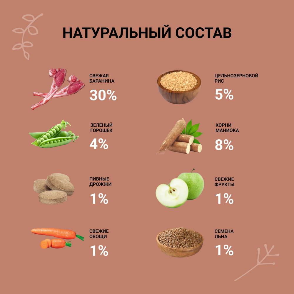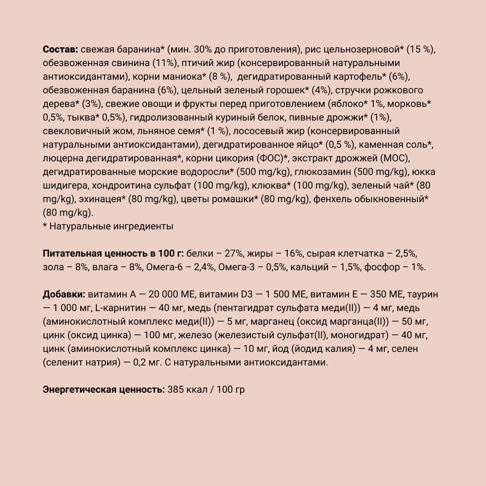 - 30% свежего мяса ягнёнка гарантирует вкусовую привлекательность для питомца, а общее содержание мяса, мясных и рыбных ингредиентов превышает 50%.
