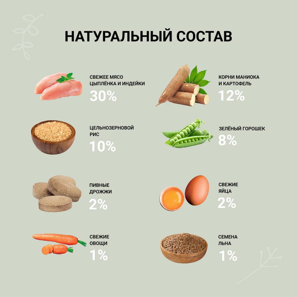 - 30% свежего мяса цыплёнка и индейки гарантирует вкусовую привлекательность для питомца, а общее содержание мяса, мясных и рыбных ингредиентов превышает 50%.