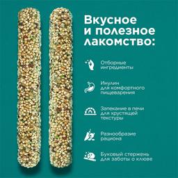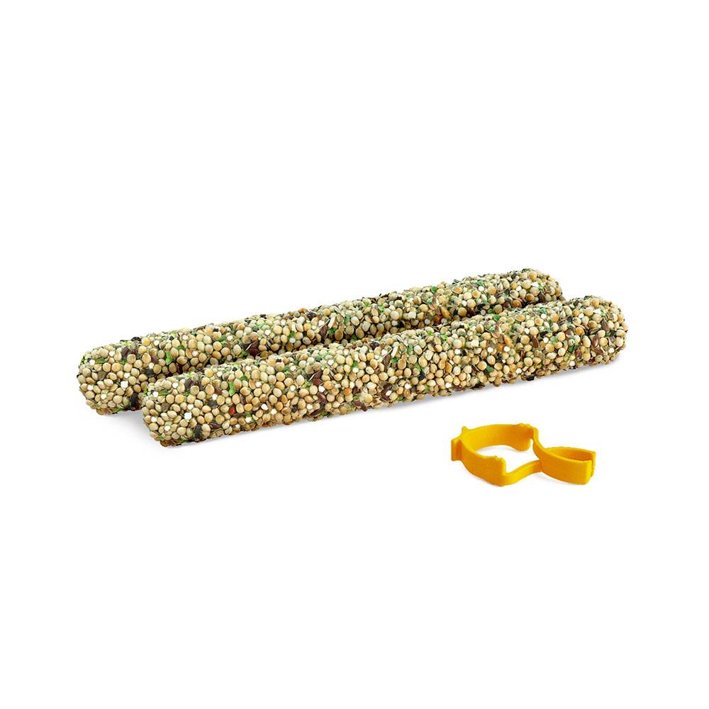 Палочки Суперзелень и водоросли – вкусное и полезное лакомство для разнообразия рациона волнистых попугайчиков и экзотов. Рецептура палочек включает инновационные ингредиенты богатые растительным белком и минералами: базилик, шпинат, сельдерей и водоросли. Лакомства выпекаются в печи и приобретают яркий вкус и хрустящую текстуру, которая так нравится волнистым попугайчикам и амадинам. Основа палочки – прочный буковый стержень, который служит отличным инструментом для стачивания клюва.
