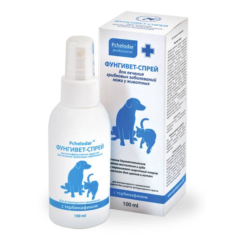 Фунгивет предназначен для лечения грибковых заболеваний у животных. Действующее вещество, тербинафина гидрохлорид, обладает широким спектром фунгицидного действия (Trichophyton rubrum, Т. mentagrophytes, Т. verrucosum, Т. violaceum, Т. tonsurans, Microsporum canis и Epidermophyton floccosum, Malassezia furfur, Candida), глубоким проникновением и накоплением в поверхностном слое коже, оказывает более длительный терапевтический эффект. Экстракт прополиса обладает выраженным противовоспалительным, антибактериальным и ранозаживляющим свойством на кожу животного, подавляет развитие вторичной микрофлоры и ускоряет время лечения.
