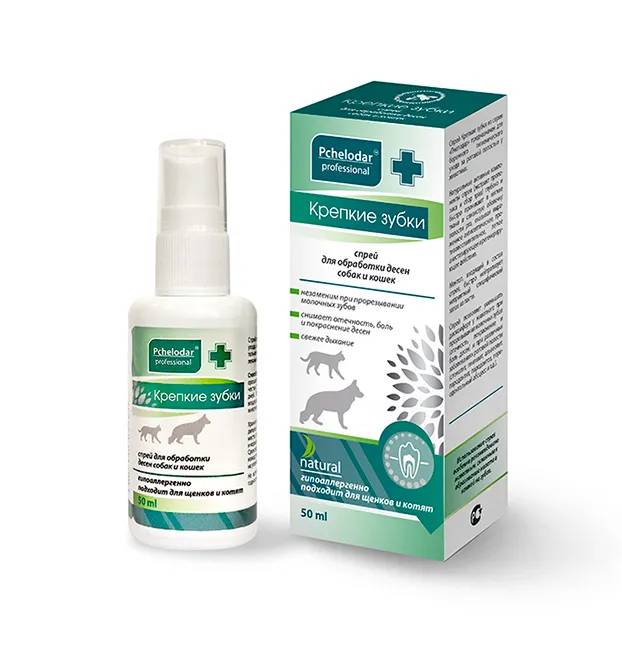 Спрей Крепкие зубки предназначен для бережного гигиенического ухода за ротовой полостью у животных. Натуральные активные компоненты средства Крепкие зубки глубоко и быстро проникают в мягкие ткани и слизистую оболочку полости рта животного, оказывая выраженное противовоспалительное, антисептическое, легкое анестезирующее и регенерирующее действие. Содержание натурального экстракта прополиса и сбора рав позволяет при регулярном использовании препарата Крепкие зубки бережно и эффективно ухаживать за ротовой полостью, профилактировать образование налета и зубного камня. Ментол, входящий в состав, помогает быстро устранить неприятный специфический запаха из пасти животного. Спрей Крепкие зубки высокоэффективен при дискомфорте в ротовой полости (отечность, покраснение и болезненность десен) при прорезывании молочных зубов и при различных заболеваниях полости рта у животных.