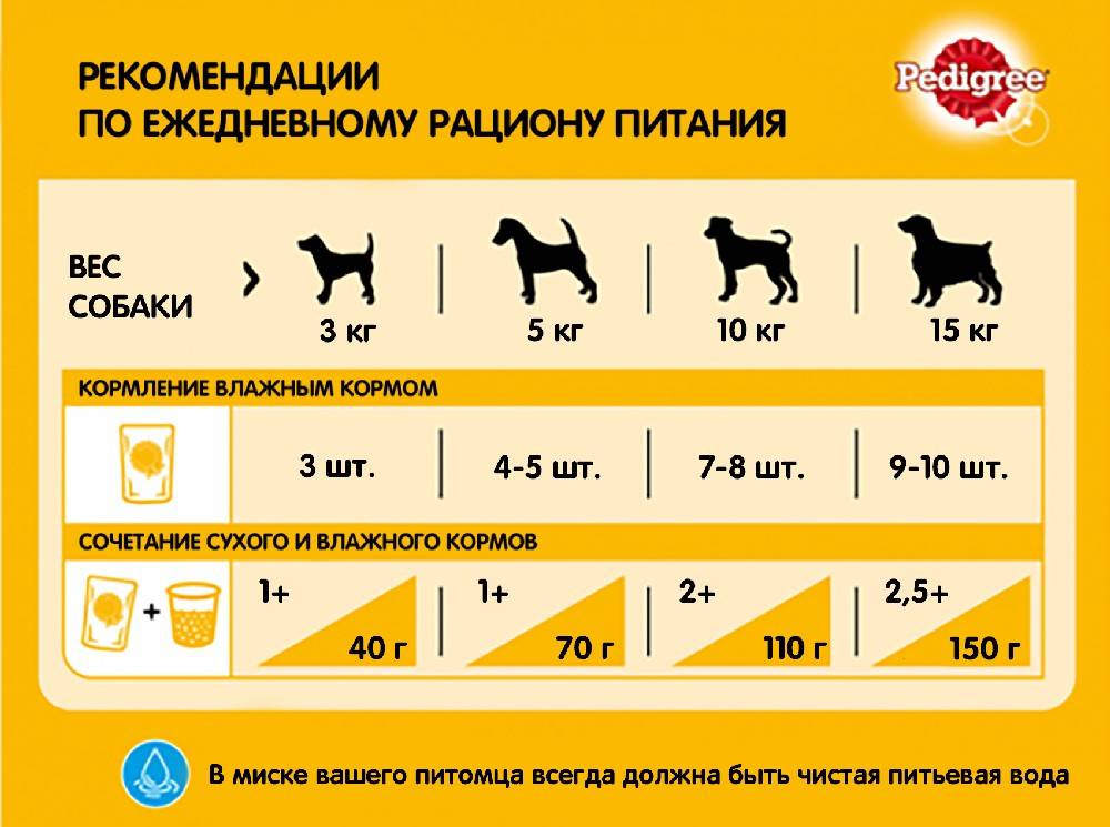 бренд PEDIGREE® рекомендует сочетать разные форматы корма в рационе Вашей собаки. Утром и вечером Вашему питомцу нужно давать влажный рацион, а в течение дня — сухой. Это позволит объединить преимущества каждого из форматов, ведь ее рацион должен быть не только вкусным, но и тщательно сбалансированным. Нужно помнить, что смешивать в одной миске сухой и влажный рационы не рекомендуется. Кроме того, у вашей собаки всегда должен быть доступ к чистой питьевой воде. Рационы PEDIGREE® содержат все необходимые витамины и минералы, белки, жиры и углеводы, чтобы поддержать здоровье Вашей собаки.