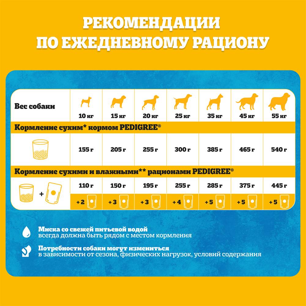 бренд PEDIGREE® рекомендует сочетать разные форматы корма в рационе Вашей собаки. Утром и вечером Вашему питомцу нужно давать влажный рацион, а в течение дня — сухой. Это позволит объединить преимущества каждого из форматов, ведь ее рацион должен быть не только вкусным, но и тщательно сбалансированным. Нужно помнить, что смешивать в одной миске сухой и влажный рационы не рекомендуется. Кроме того, у вашей собаки всегда должен быть доступ к чистой питьевой воде. Рационы PEDIGREE® содержат все необходимые витамины и минералы, белки, жиры и углеводы, чтобы поддержать здоровье Вашей собаки.