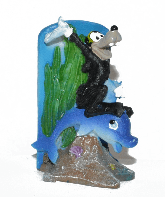 В этой аквариумной декорации Гуфи выполнен плывущим верхом на дельфине.