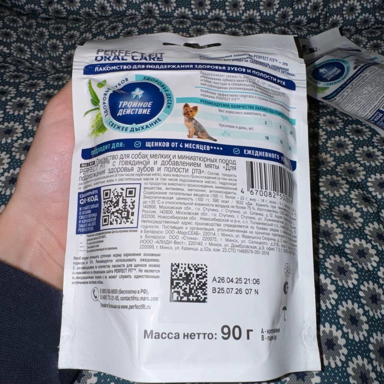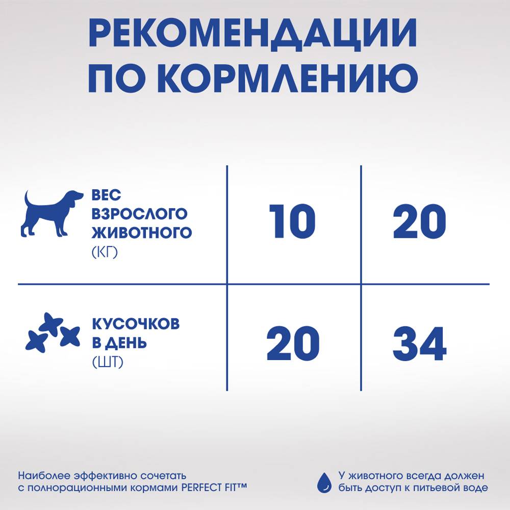 Функциональное лакомство PERFECT FIT™ с говядиной и добавлением перечной мяты обладает тройным действием: поддерживает здоровье зубов, десен и свежесть дыхания вашей собаки мелкой или миниатюрной породы. Комплекс витаминов и минералов, особая текстура и специальный компонент STPP (триполифосфат натрия) помогают организму поддержать здоровье зубов и полости рта при соблюдении рекомендаций по кормлению. Лакомство обладает подтвержденной эффективностью в снижении образования зубного налета, согласно исследованиям.