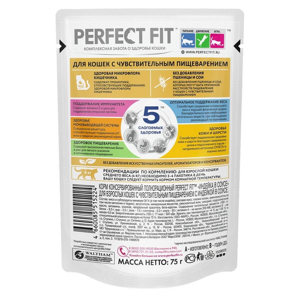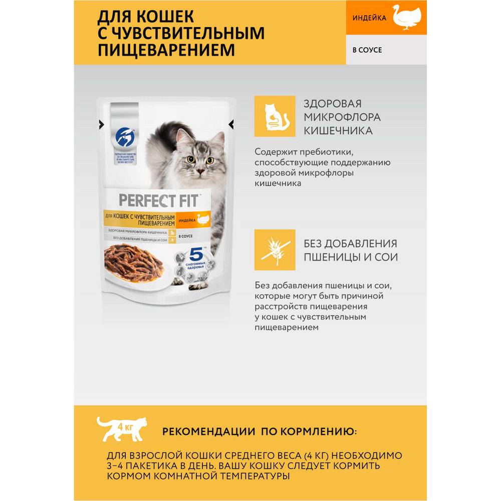 Влажный корм в паучах PERFECT FIT™ Sensitive с индейкой в соусе для кошек с чувствительным пищеварением содержит пребиотики, способствующие поддержанию здоровой микрофлоры кишечника питомца.