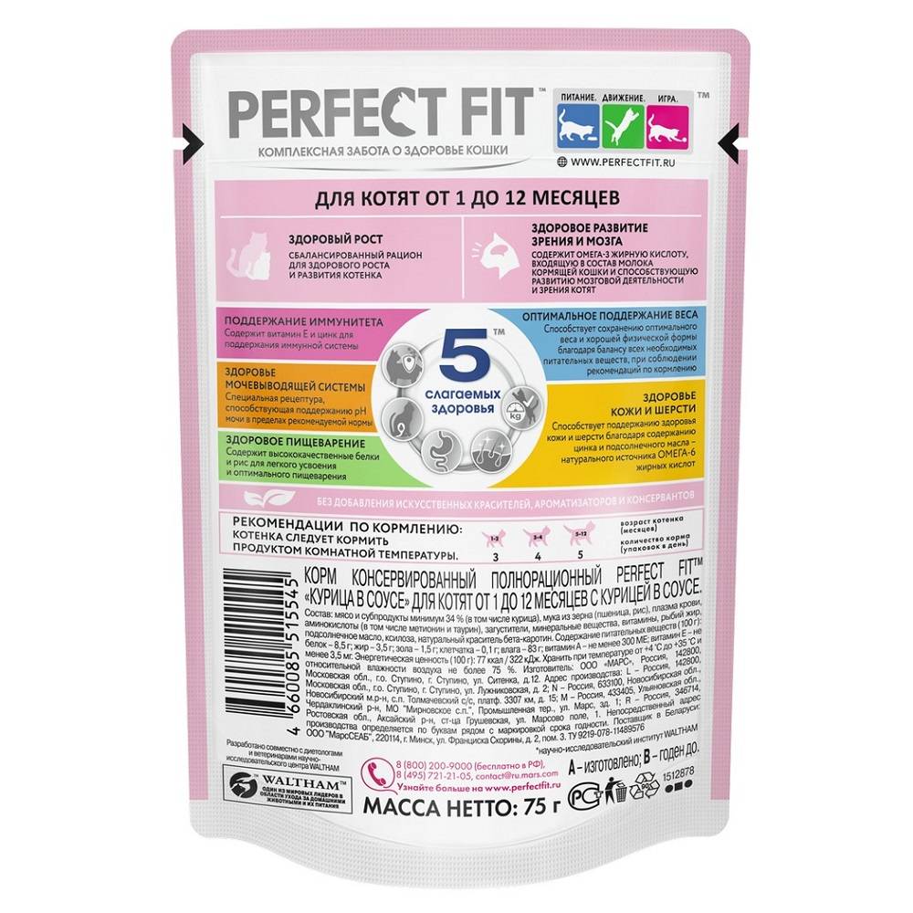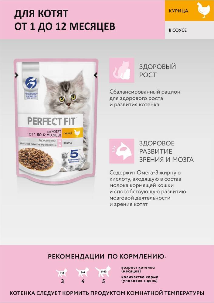 Влажный корм в паучах Perfect Fit™ для котят с курицей специально разработан с учетом потребностей молодого растущего организма.