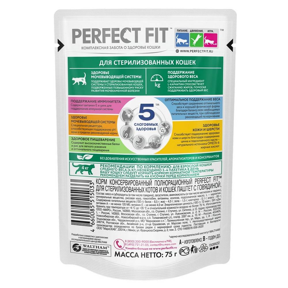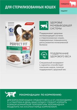 Влажный корм в паучах PERFECT FIT™ паштет с говядиной для стерилизованных кошек разработан по специальной рецептуре для контроля здоровья кошек, прошедших стерилизацию.