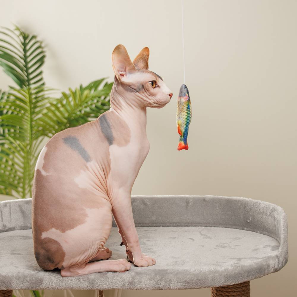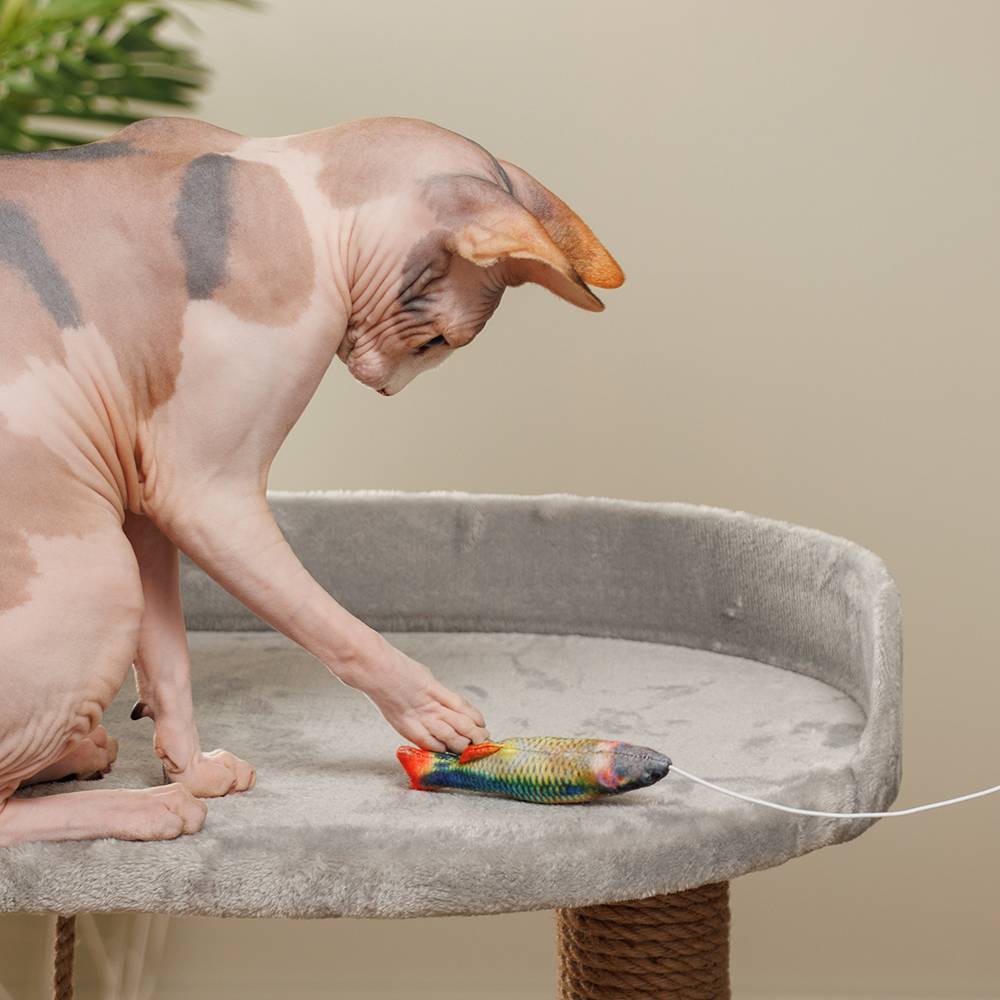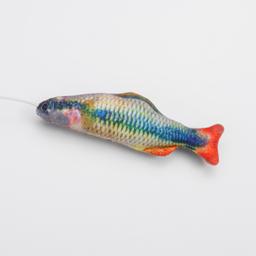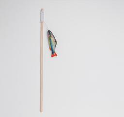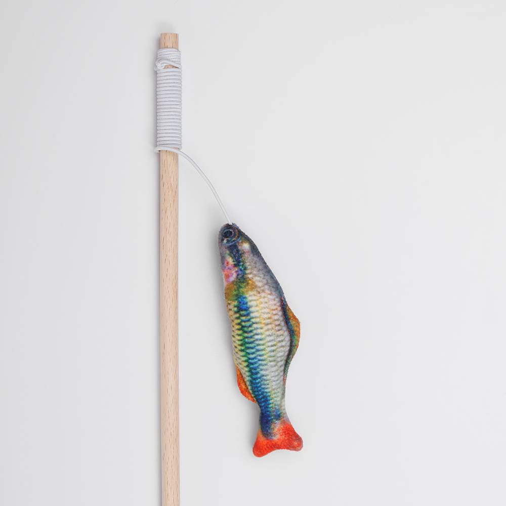 - На удочке есть игрушка-рыбка с погремушкой и натуральными ароматическими добавками (валериана, кошачья мята) для привлечения внимания питомца.