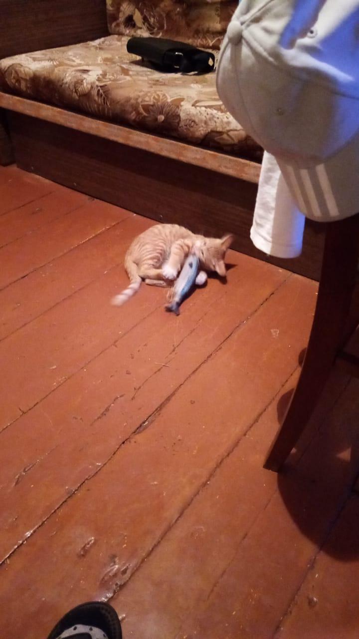 Котенку очень понравилась игрушка - скумбрия. Носится с ней, как сумасшедший! Ничего страшного, что она чуточку больше котенка.Комментарий