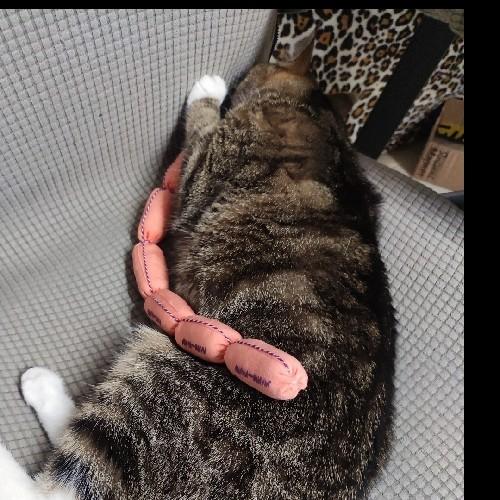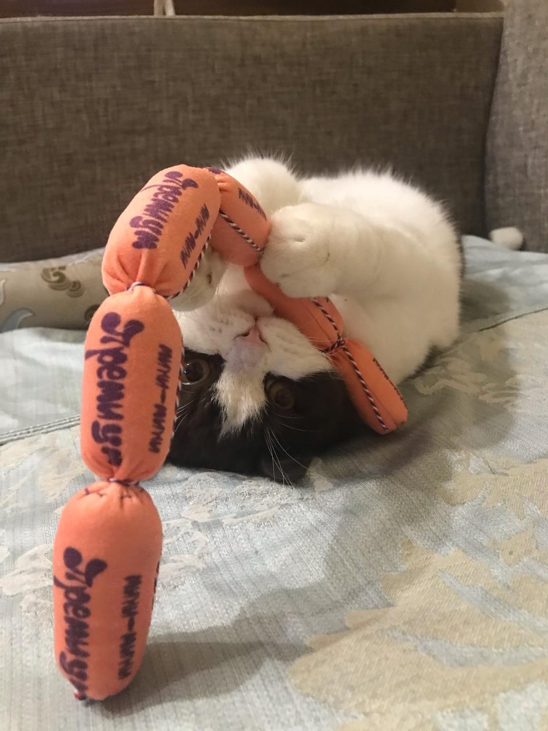 Игрушка для кошек Связка сосисок с кошачьей мятой, валерианой и погремушкой.