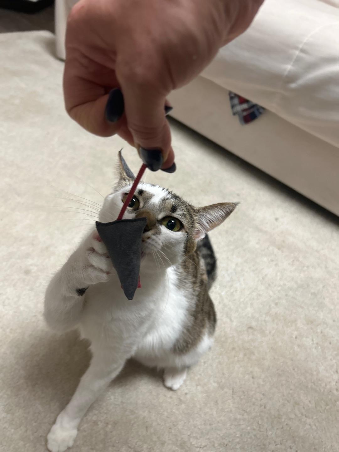 • регулярные игры с мышкой помогают улучшить зрение и скорость реакции, стимулируют кошку больше двигаться и развивать инстинкты хищника.