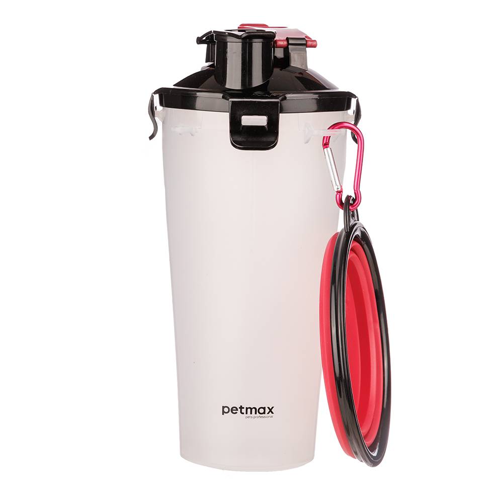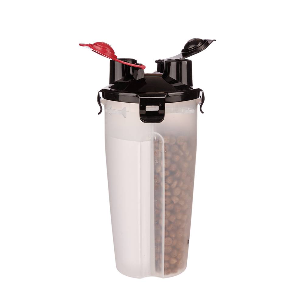 - Бутылка разделена перегородкой на 2 части, что позволяет носить сухой корм и воду одновременно.