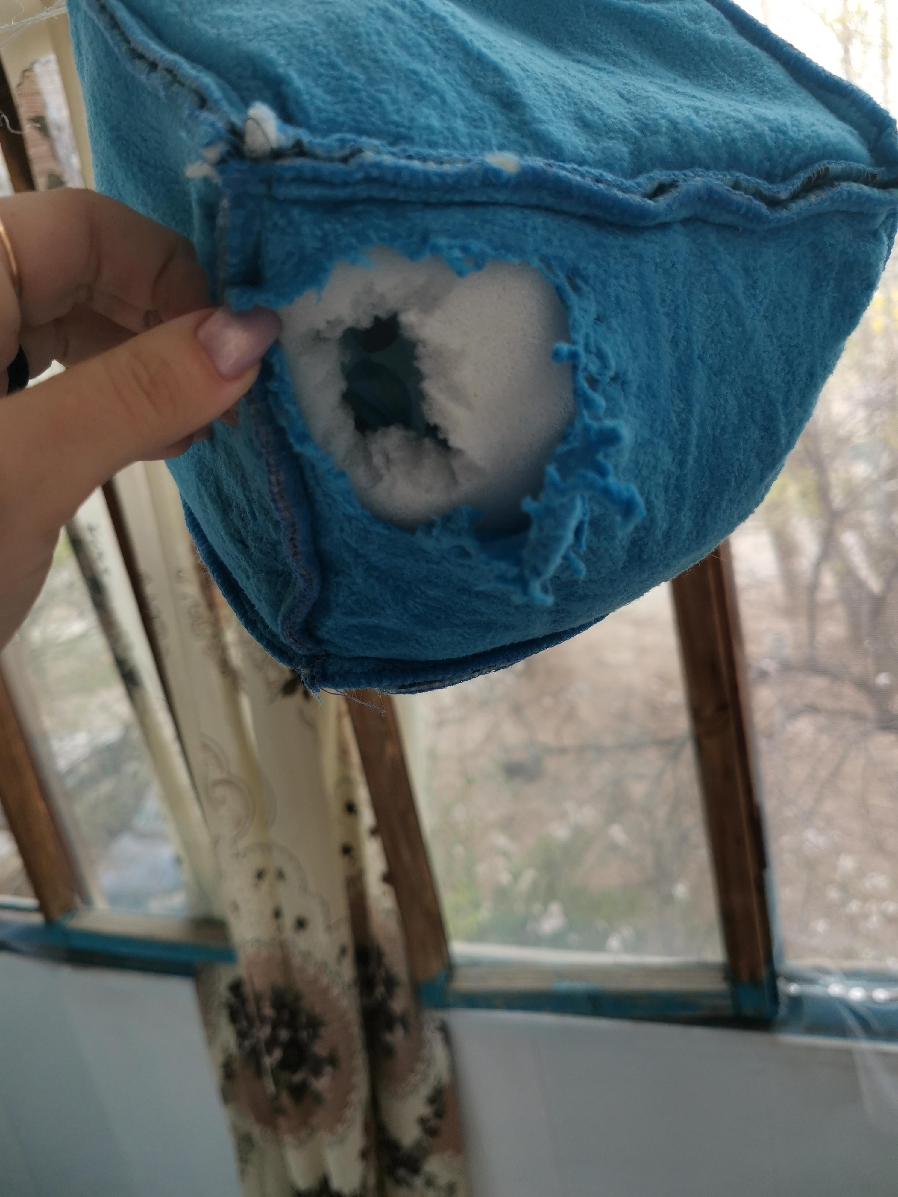 Домик прожил пару дней до тех пор, пока его не разгрызли, проделав сквозное отверстие с задней стенки.Комментарий