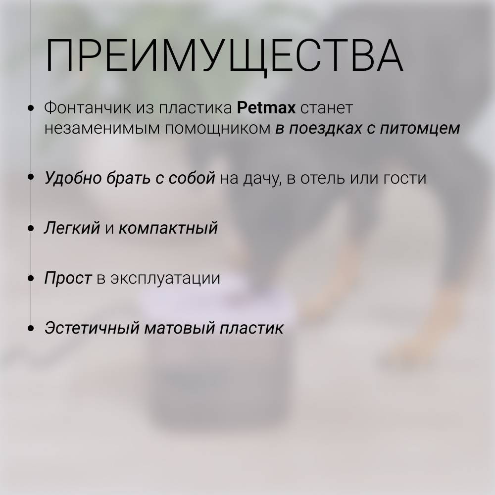Фонтанчик из пластика Petmax станет незаменимым помощником в поездках с питомцем. Его легко и просто взять с собой на дачу, в отель или гости.
