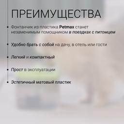 Фонтанчик из пластика Petmax станет незаменимым помощником в поездках с питомцем. Его легко и просто взять с собой на дачу, в отель или гости.