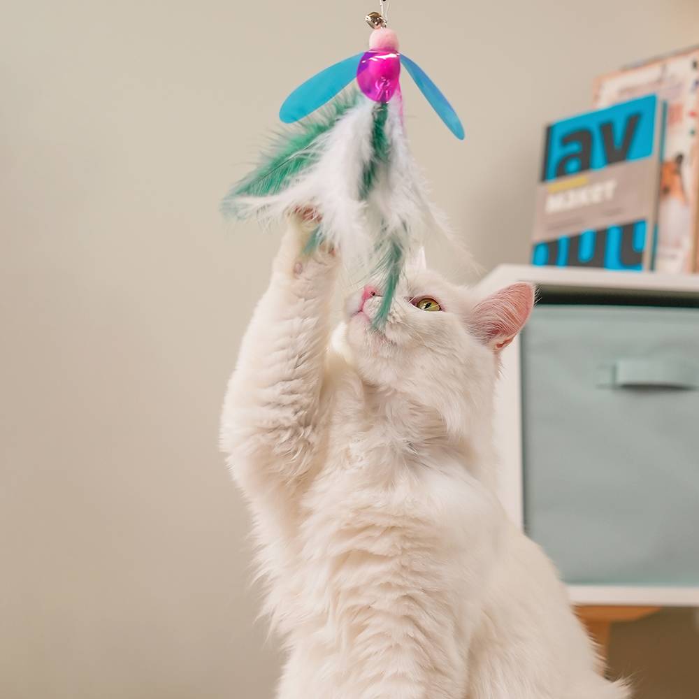 - На игрушке есть перья и колокольчики для привлечения внимания питомца.