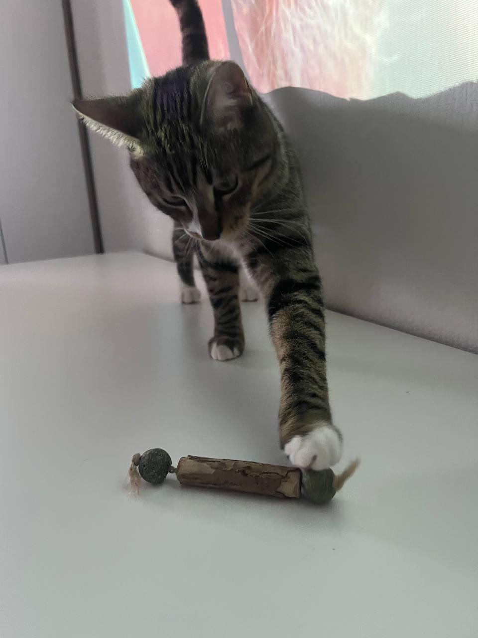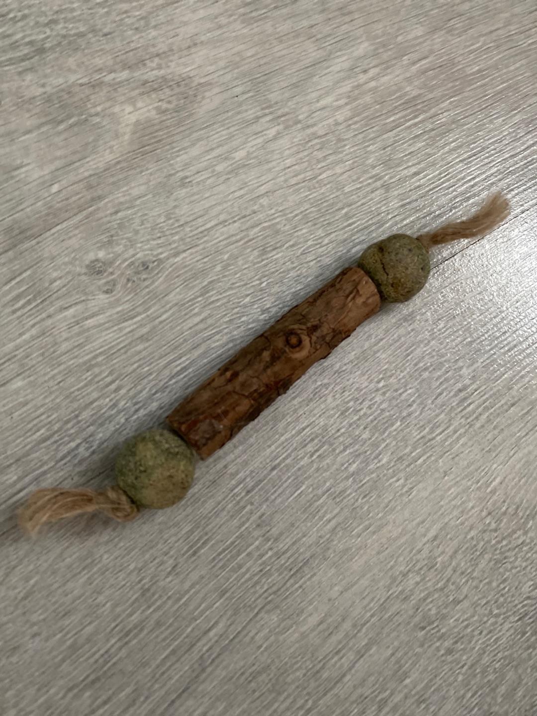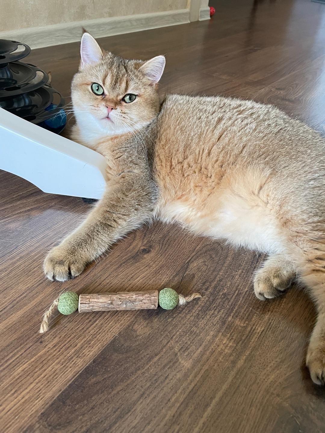 Понравилась и сама палочка, легкая, можно легко подбрасывать лапками, и шарики - их очень весело грызть, и веревочные хвостики - создают дополнительный интерес.Комментарий