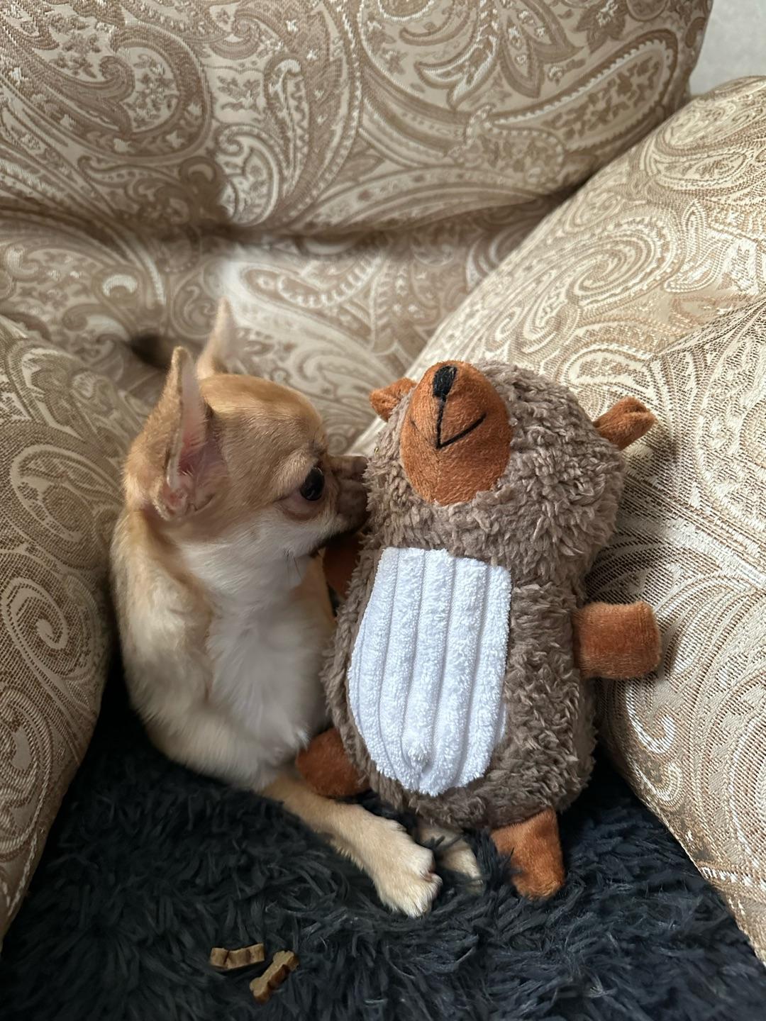 У меня такса, кобель. Все мягкие игрушки, обычно, живут у нас не больше получаса. Этот же бобер/белка живет второй месяц!!!Удивительно, но факт. Только недавно порвался, и то совсем чуть-чуть. Зашью.