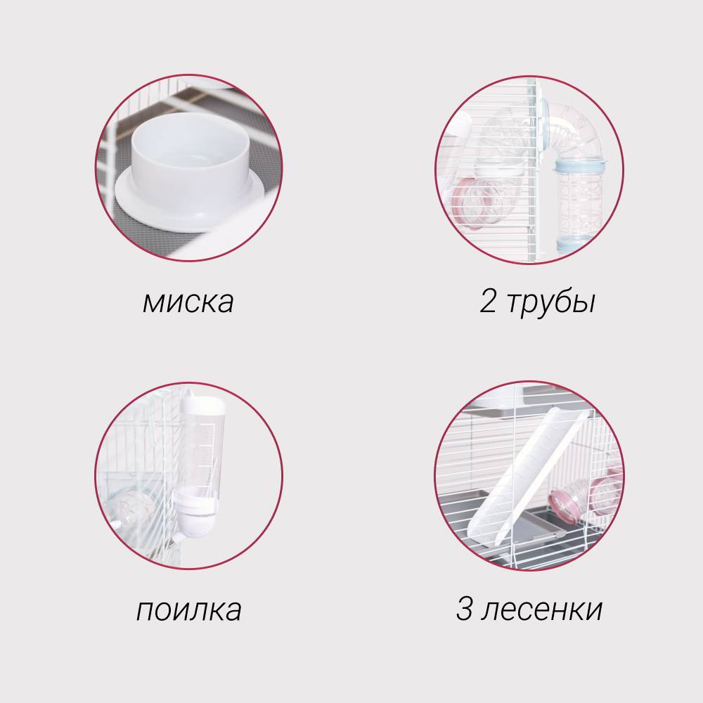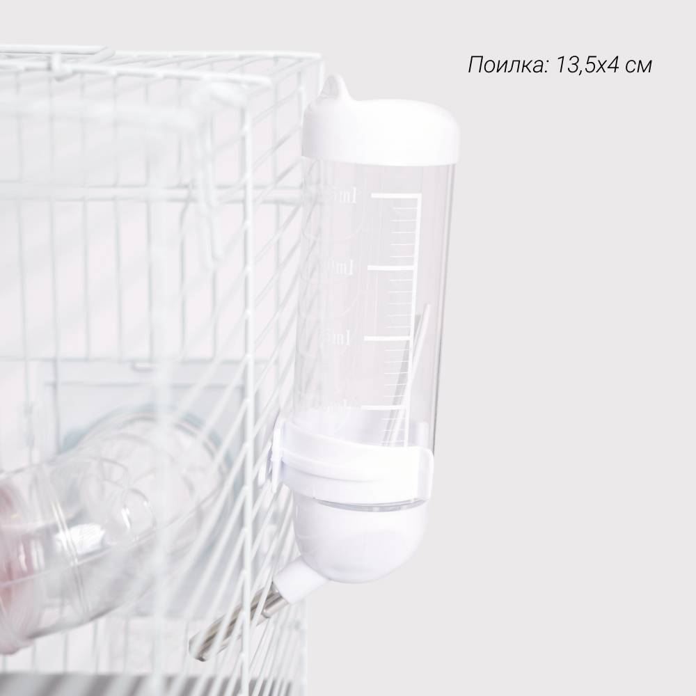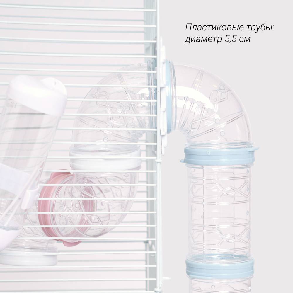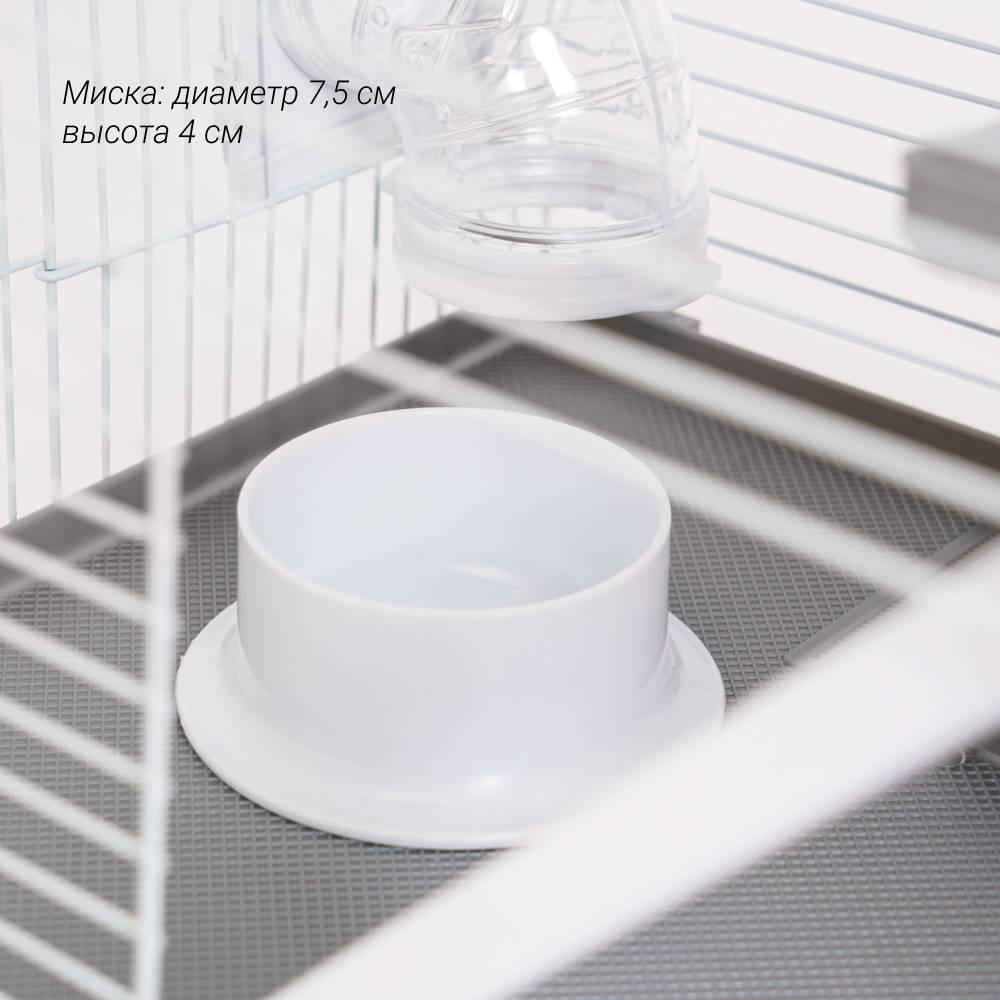 - В комплекте миска (диаметр: 7,5 см, высота: 4 см) и поилка (13,5х4 см), 2 пластиковые трубы (диаметр 5,5 см).