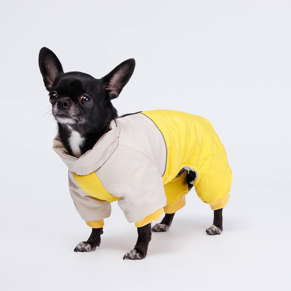 Комбинезон с диагональным замком защитит питомца от холода, ветра, дождя и снега.