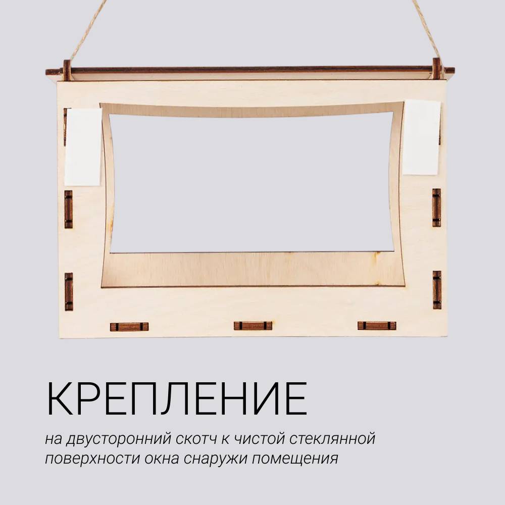 - Основной способ крепления кормушки является приклеивание на двусторонний скотч задней стенки к чистой стеклянной поверхности окна снаружи помещения. Во избежание падения кормушки необходимо надежно закрепить ее с помощью шнура, например привязав к оконной ручке.