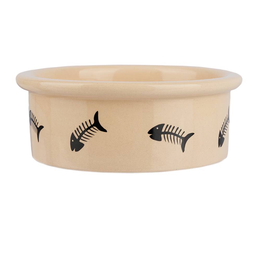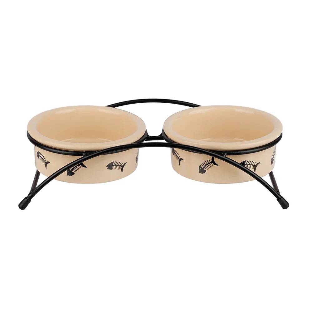 Миска двойная на подставке для кошек и собак с рыбкой бежевая керамика, 2 миски объемом 250 мл, диаметр 12,5 см.
