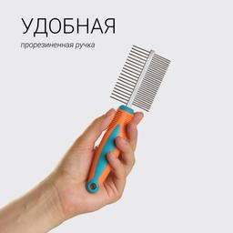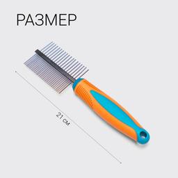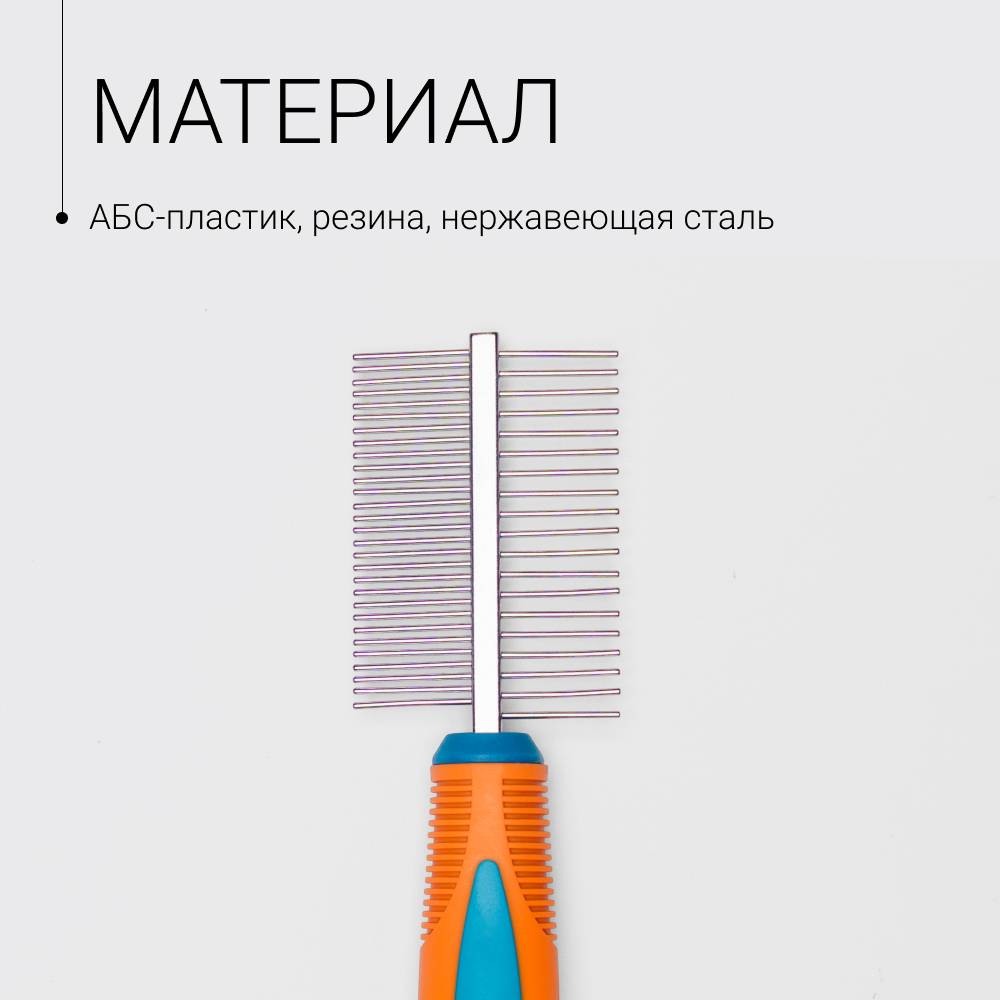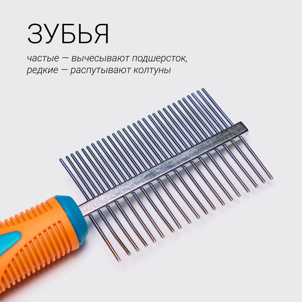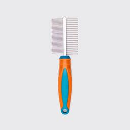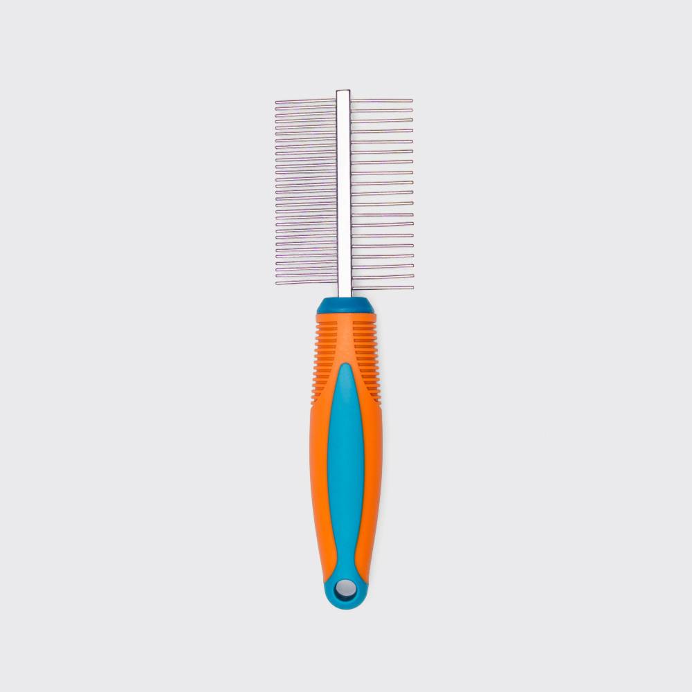 Расческа двухсторонняя с частыми и редкими зубьями от бренда Petmax предназначена для длинношерстных питомцев с густым подшерстком.