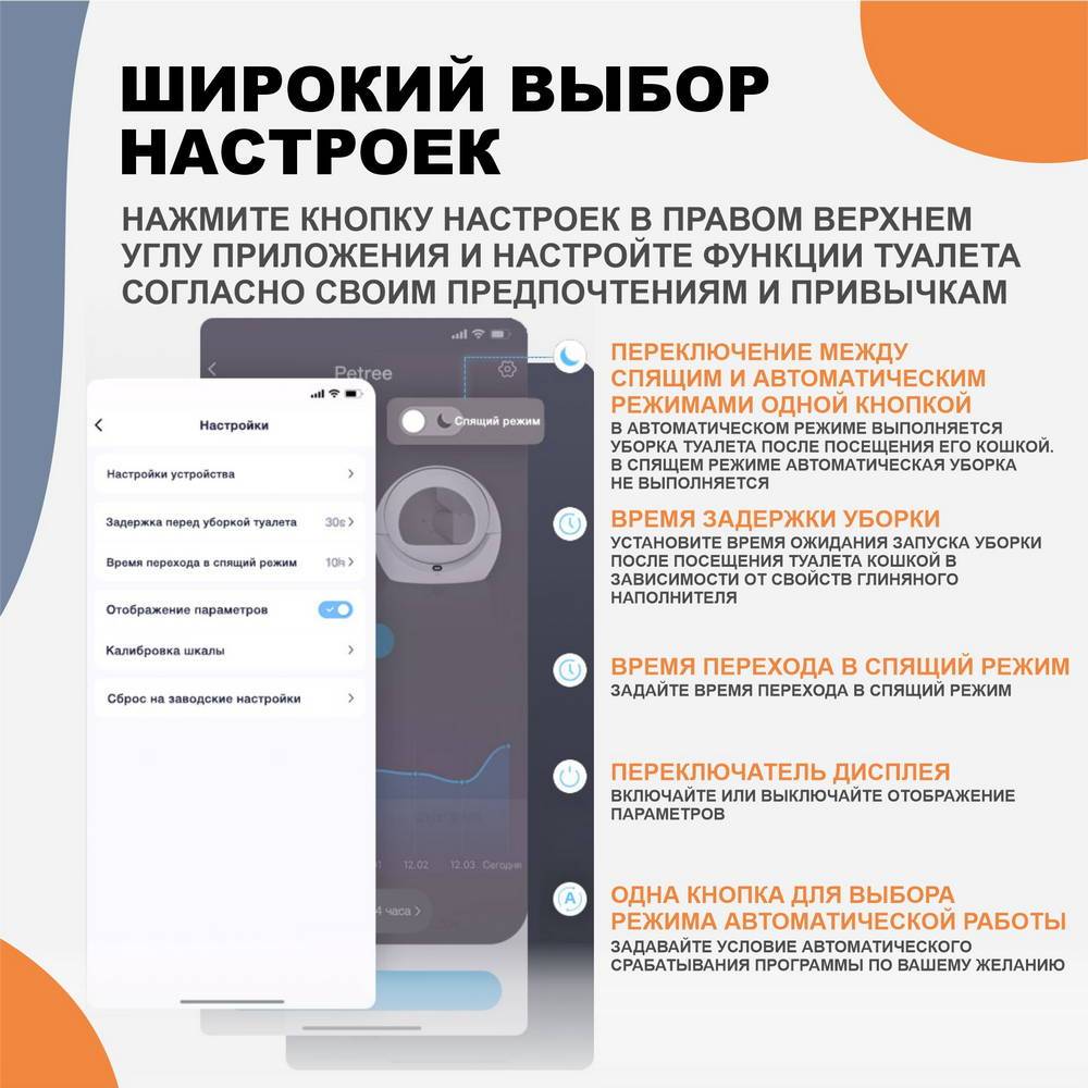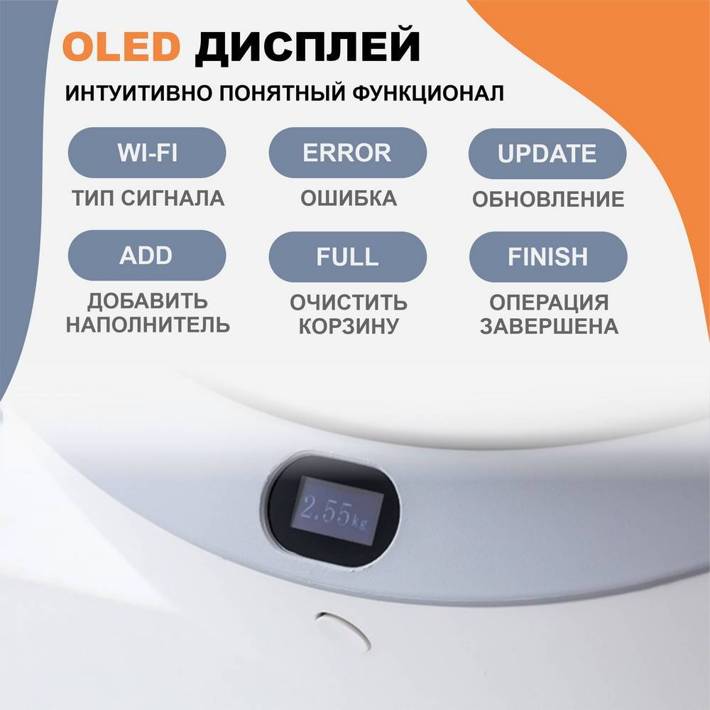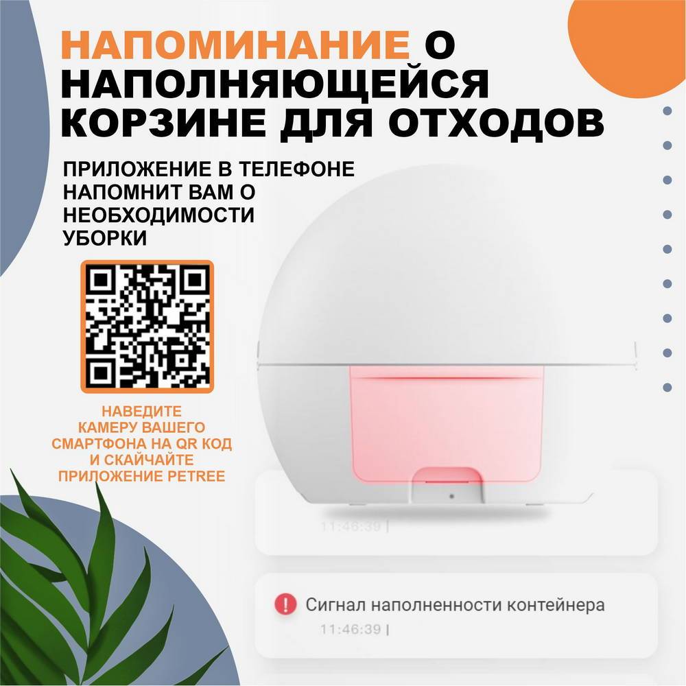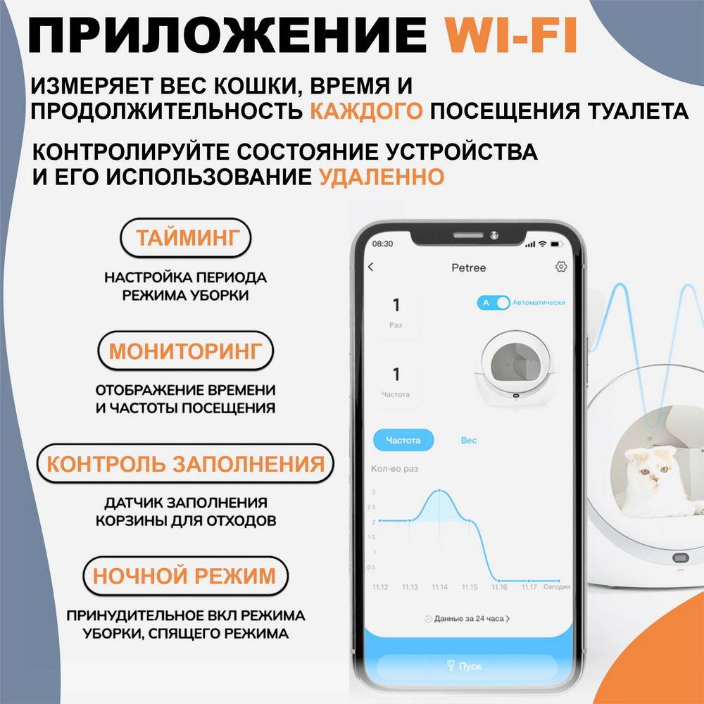 Управление через приложение на вашем смартфоне, посредством соединения WIFI подключения, позволит осуществить настройку устройства и контролировать процесс уборки кошачьего туалета даже вне дома.