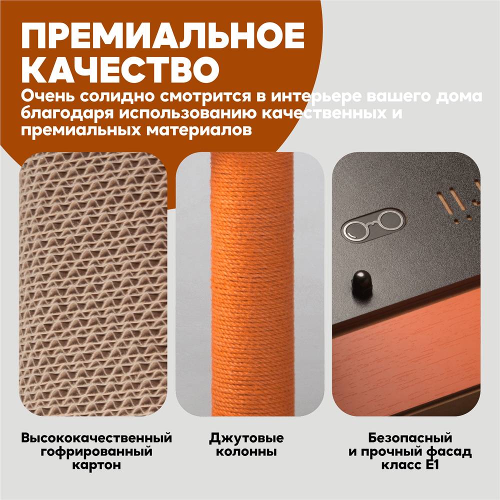 - Очень солидно смотрится в интерьере вашего дома благодаря использованию качественных и премиальных материалов: высококачественный гофрированный картон, безопасный и прочный фасад МДФ класс Е1.